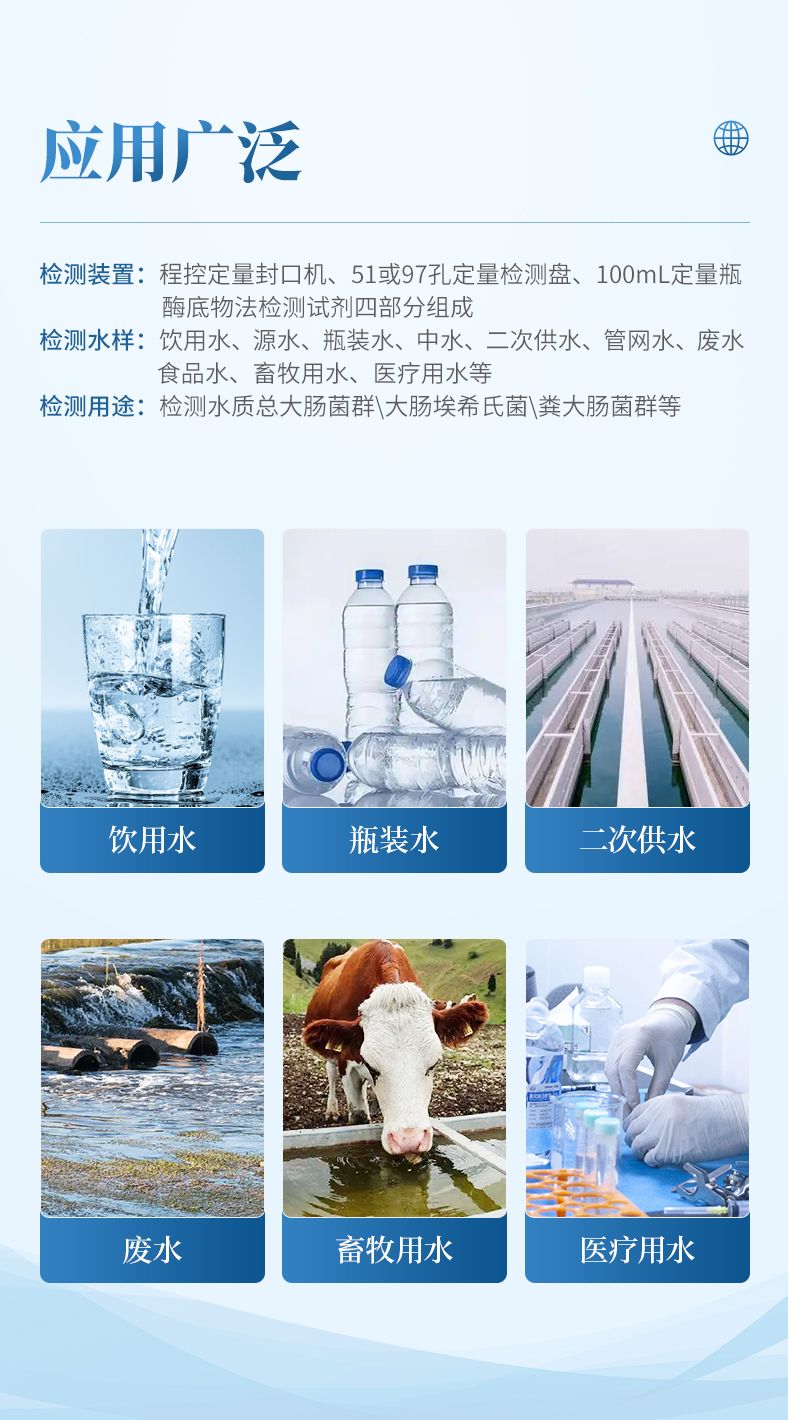 酶底物法檢測裝置由程控定量封口機、51 或 97 孔定量檢測盤、100mL定量瓶、酶底物法檢測試劑四部分組成,檢測水樣范圍:飲用水、源水、瓶裝水、中水、二次供水、管網水、廢水、食品水、畜牧用水、醫療用水等。
