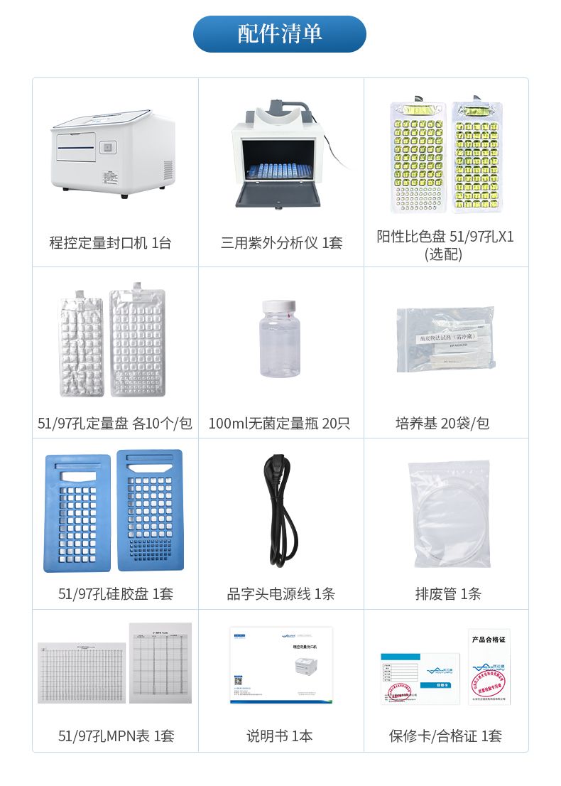 符合GB5750-2006《生活飲用水標準檢驗方法》固定底物技術酶底物法的MMO-MUG培養基配套使用程控定量封口機,檢測水樣用(51孔定量盤)或(97孔定量盤)封裝。