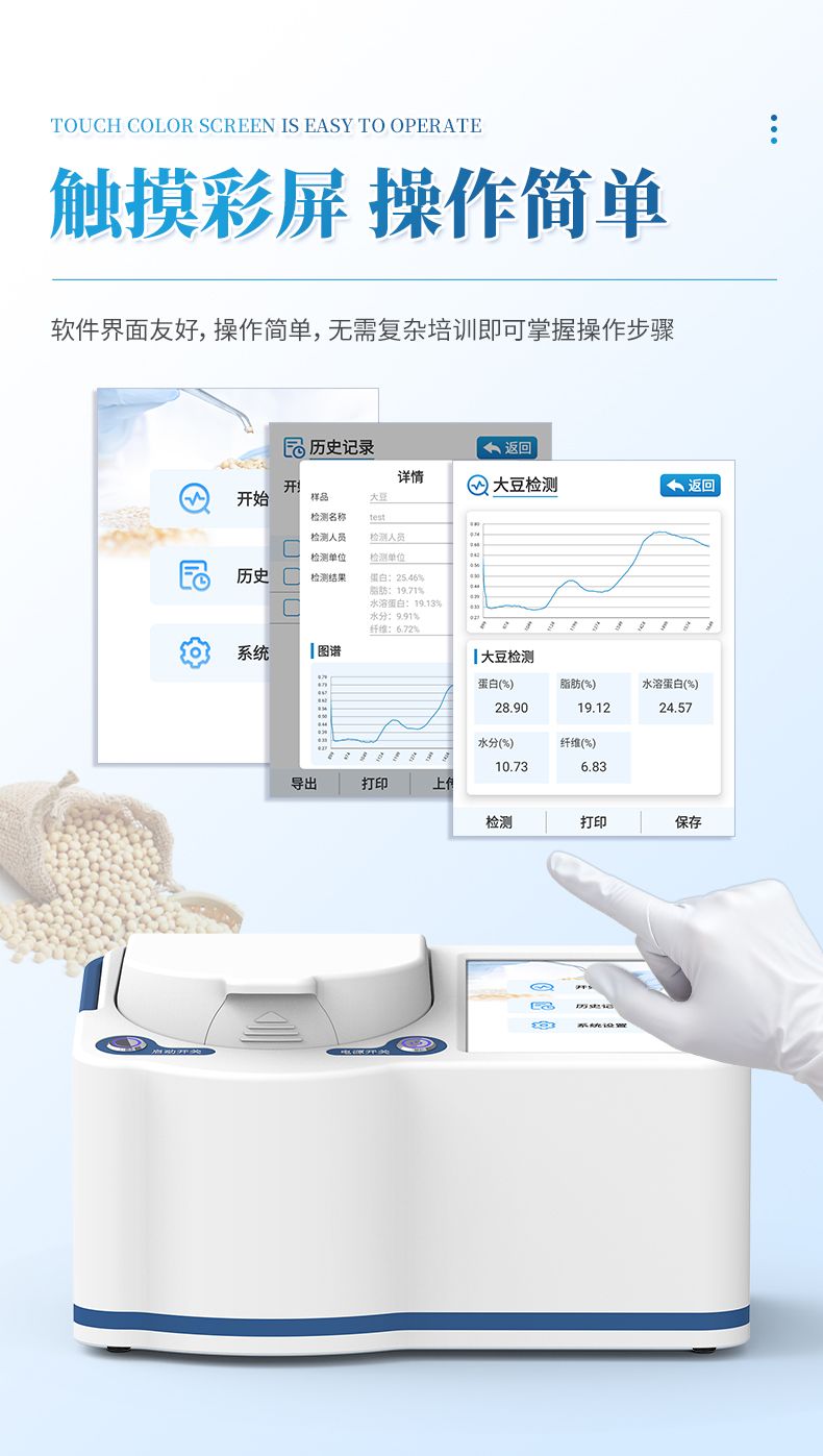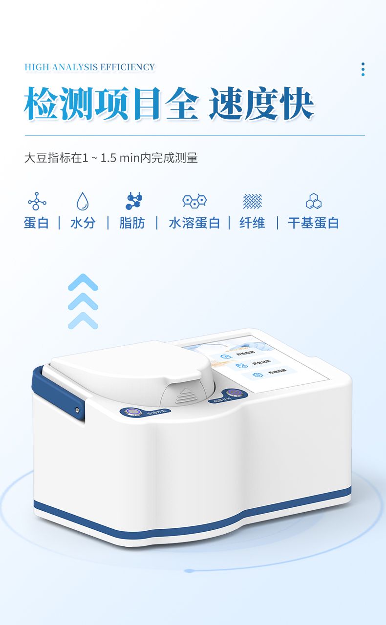 便攜式近紅外大豆蛋白儀采用先進(jìn)的近紅外光譜技術(shù),可同時(shí)無損檢測大豆中的蛋白質(zhì)、脂肪、水溶性蛋白、干基蛋白、纖維和水分等指標(biāo)。分析過程無需復(fù)雜前處理,數(shù)十秒內(nèi)即可得出結(jié)果,極大提升了檢測效率,降低了時(shí)間和人力成本。該儀器操作智能簡便,結(jié)果穩(wěn)定可靠,是糧油加工、食品檢測、育種研發(fā)和貿(mào)易收購等領(lǐng)域進(jìn)行原料驗(yàn)收、過程控制與品質(zhì)評(píng)定的理想工具。