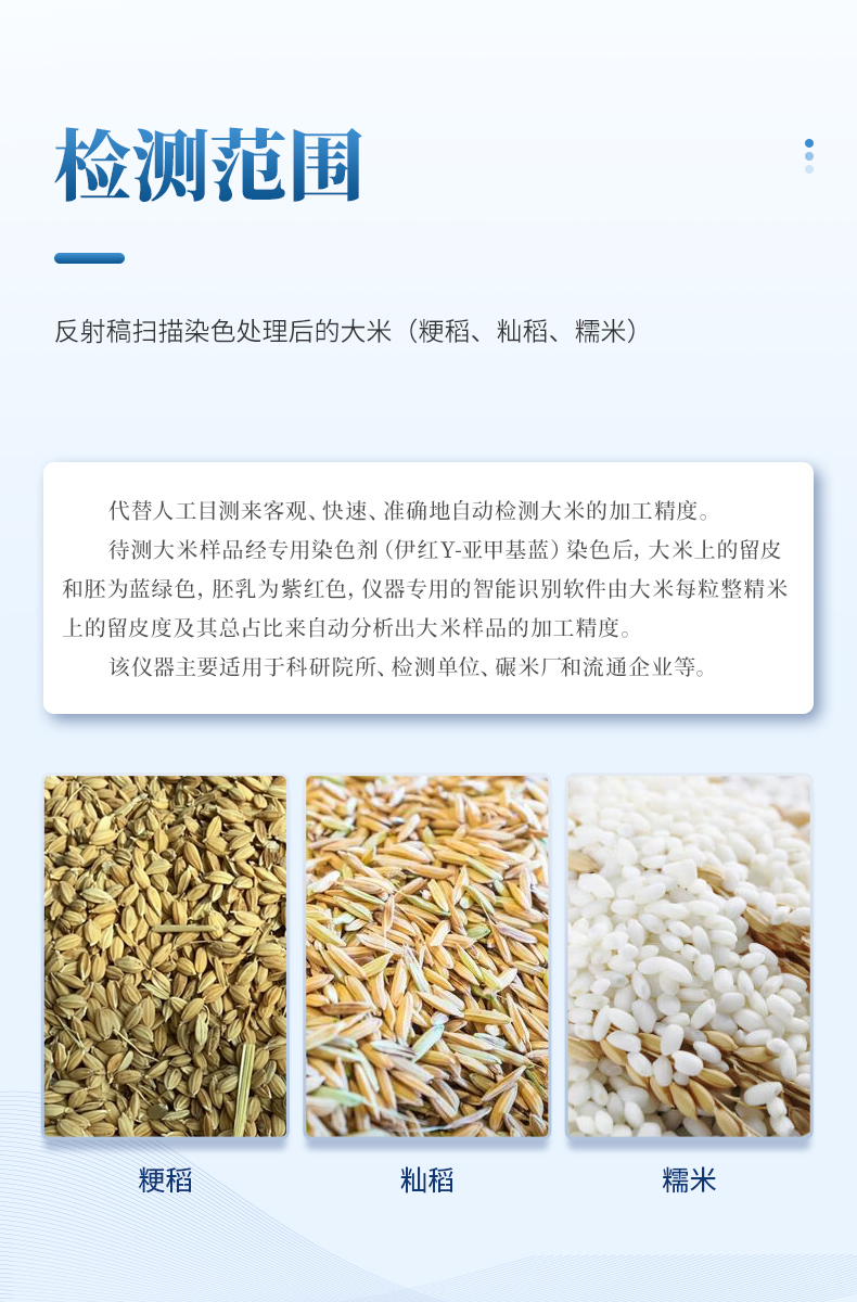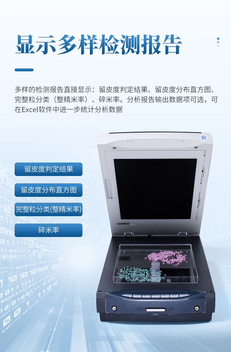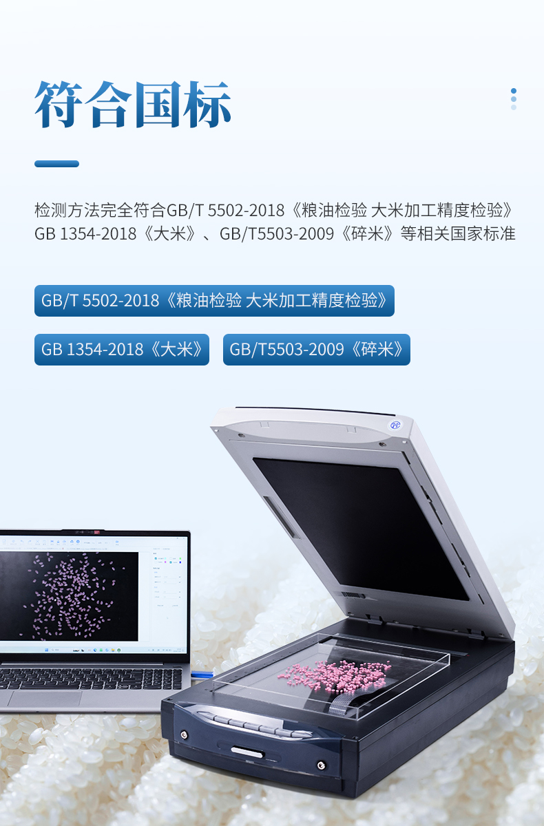 3、檢測方法完全符合GB/T 5502-2018《糧油檢驗 大米加工精度檢驗》、GB 1354-2018《大米》、GB/T5503-2009《碎米》等相關國家標準。