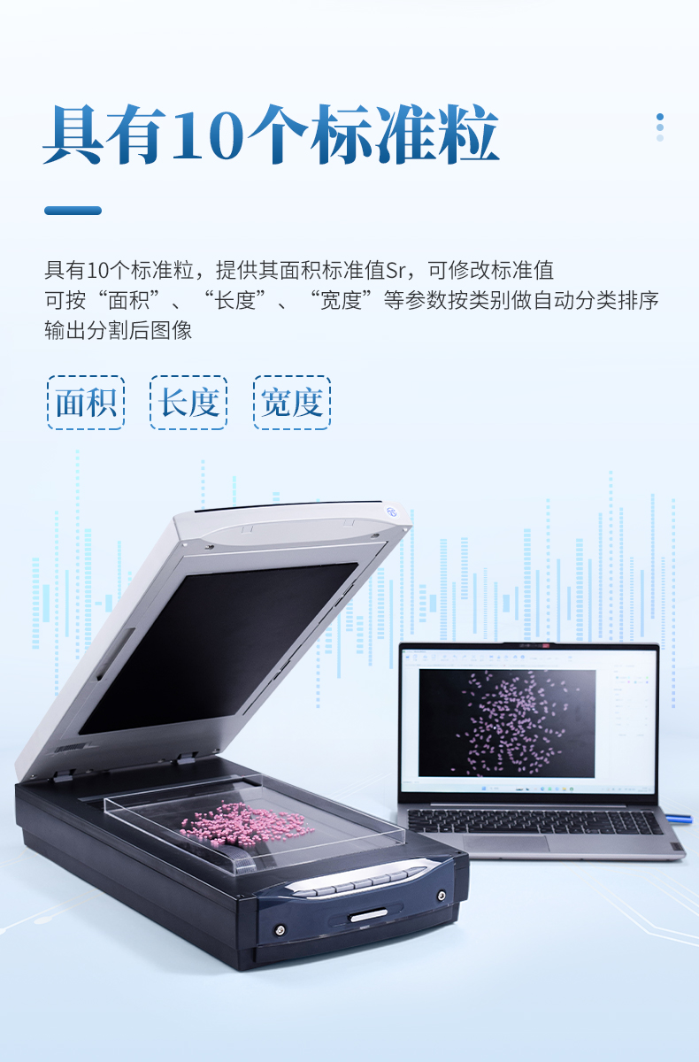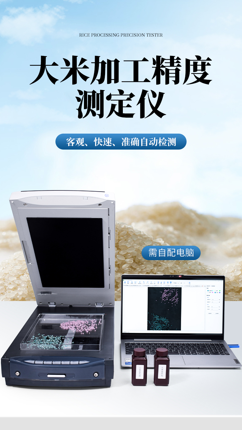 用于代替人工目測來客觀、快速、準確地自動檢測大米的加工精度。待測大米樣品經專用染色劑(伊紅Y-亞甲基藍)染色后,大米上的留皮和胚為藍綠色,胚乳為紫紅色,儀器專用的智能識別軟件由大米每粒整精米上的留皮度及其總占比來自動分析出大米樣品的加工精度。該儀器主要適用于科研院所、檢測單位、碾米廠和流通企業等。