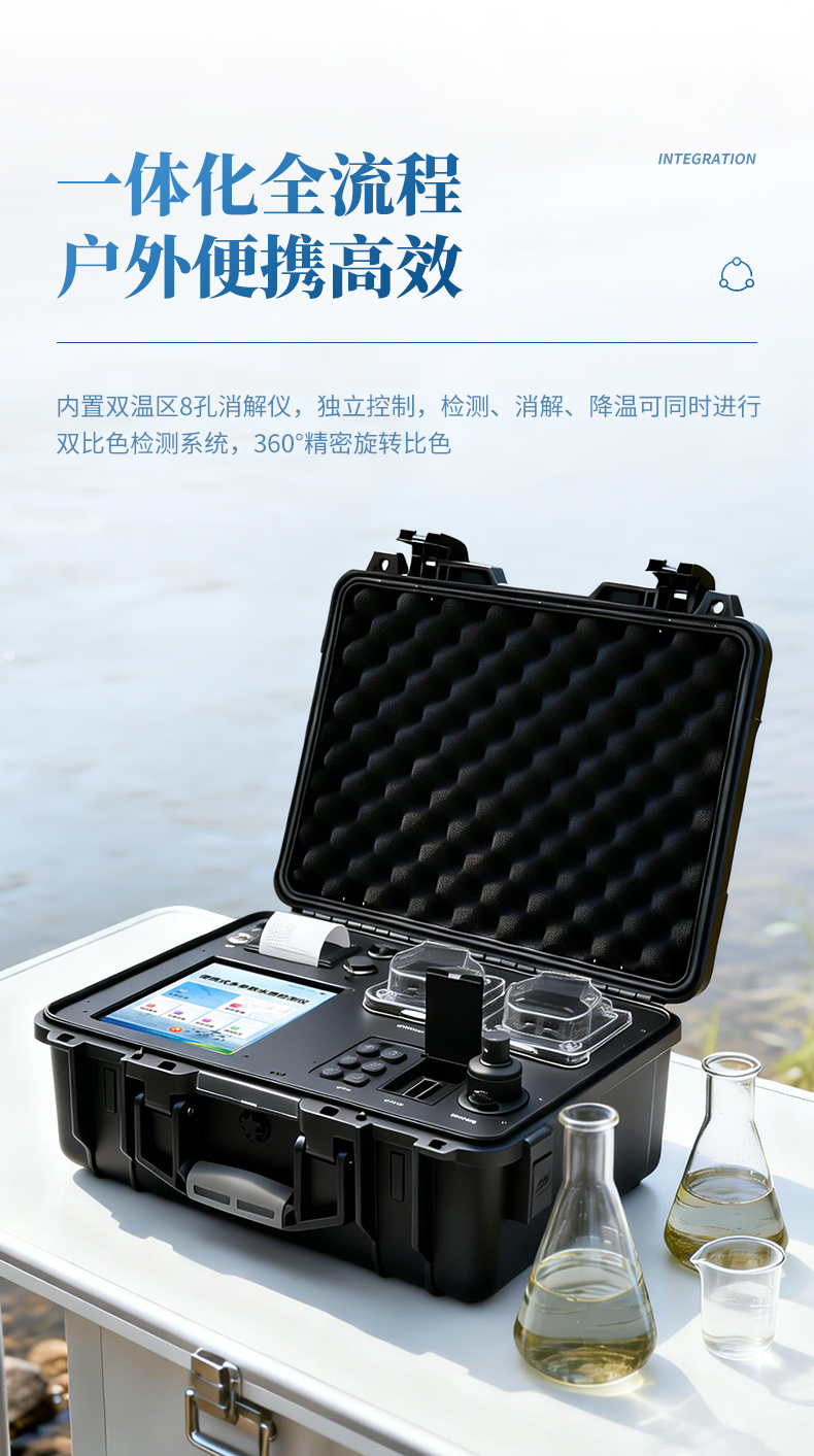 5、便攜一體式檢測設備,內置大容量鋰電池,可一機實現戶外水樣消解、測定。