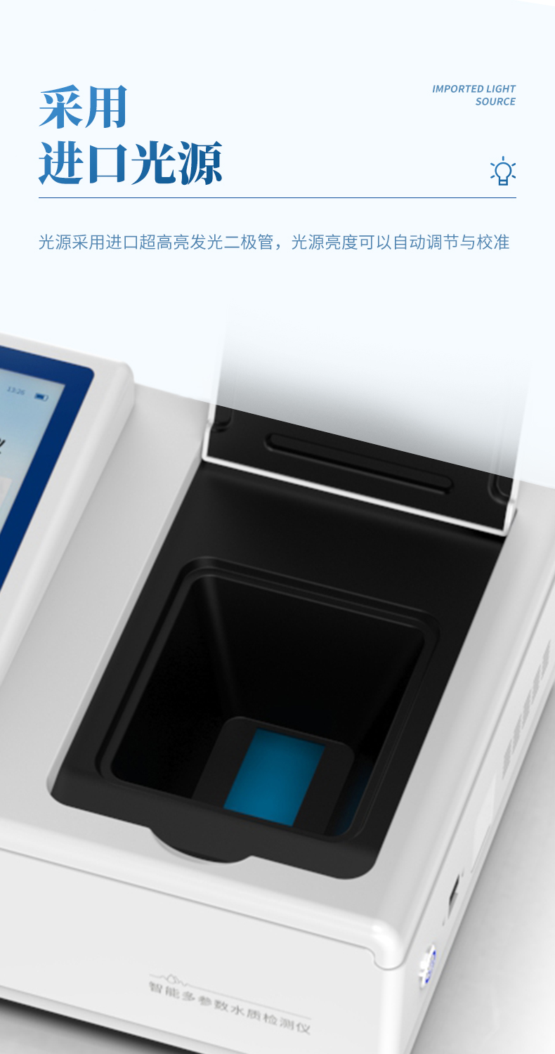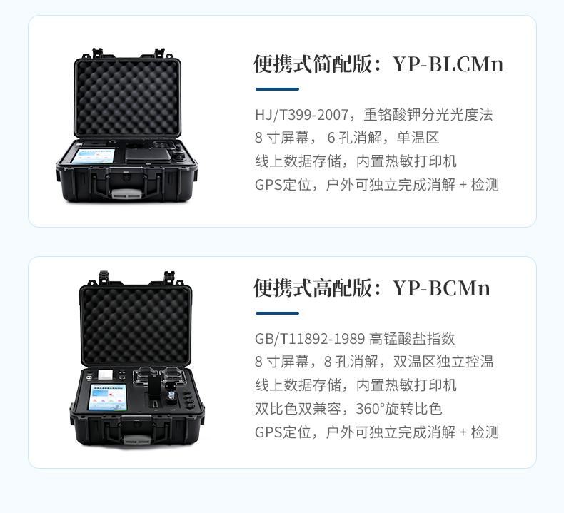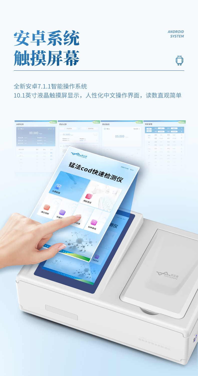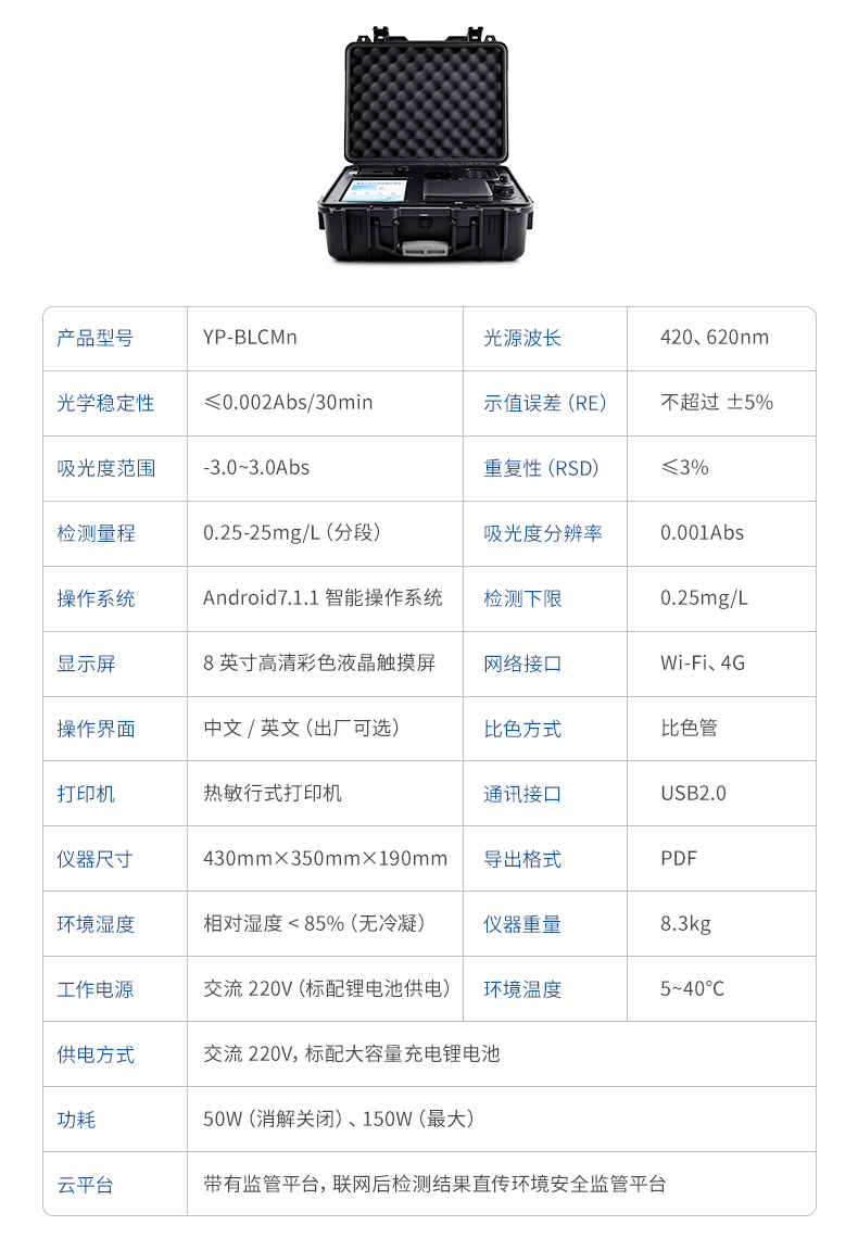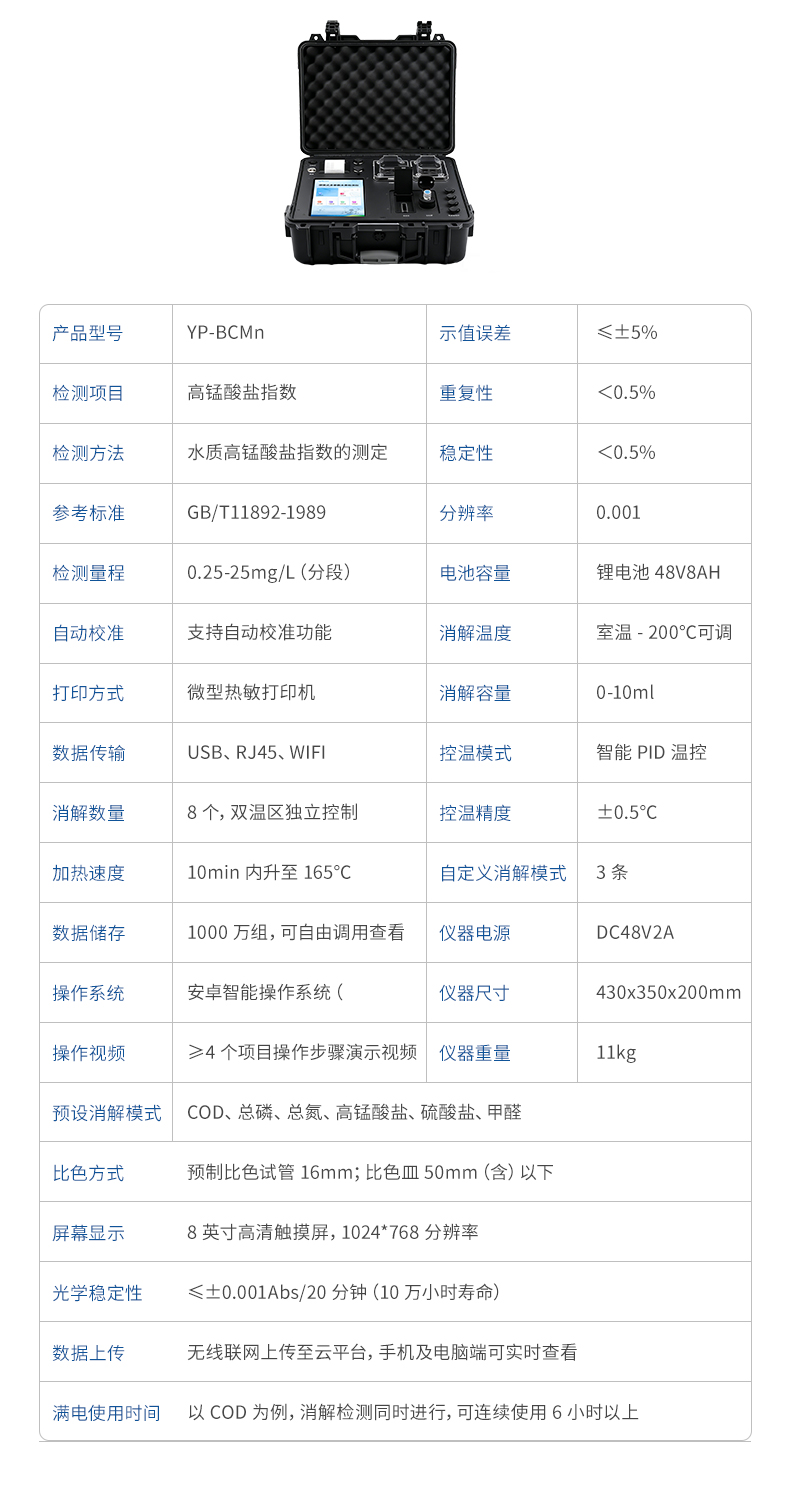 便攜式高錳酸鹽指數測定儀采用高強度PVC工程塑料手提箱設計,消解檢測一體式設計,其中消解模塊具備雙溫區功能,檢測部分同時具備360°旋轉比色試管檢測和比色皿檢測,安卓智能操作系統,8英寸高清液晶觸摸屏,光纖檢測技術,進口光源,內置大容量鋰電池,便攜多參數水質檢測儀具有性能穩定、測量準確、測定范圍廣、功能強大、操作簡單等特點。