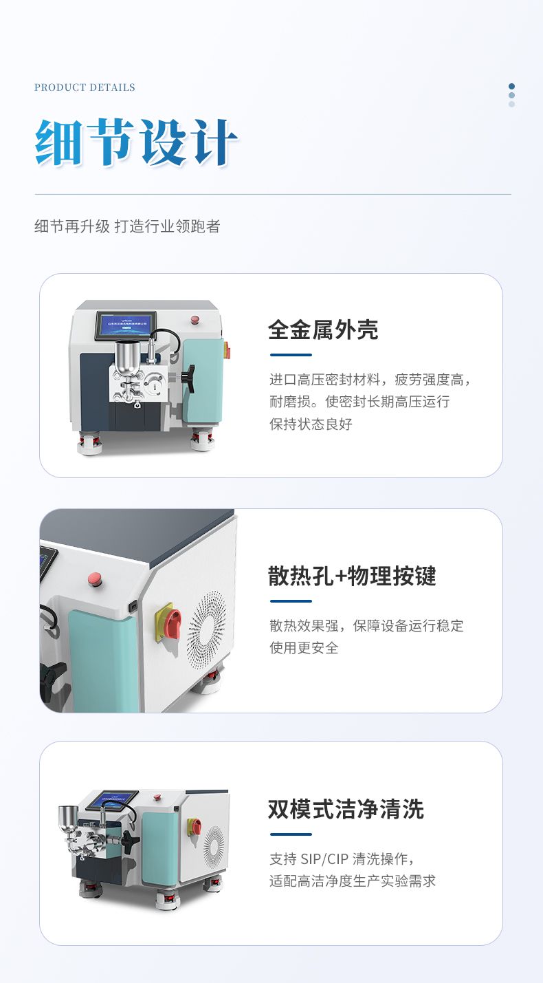 6、物料控溫:要求均質閥帶控溫夾套與控溫介質出入接頭、連接管路,可實現在線控溫,出料溫度控制在 -5℃~100 ℃ (根據物料要求不同而定);實現高壓均質部件恒溫控制,實現設備與物料同時控溫。保證物料生物學活性。
