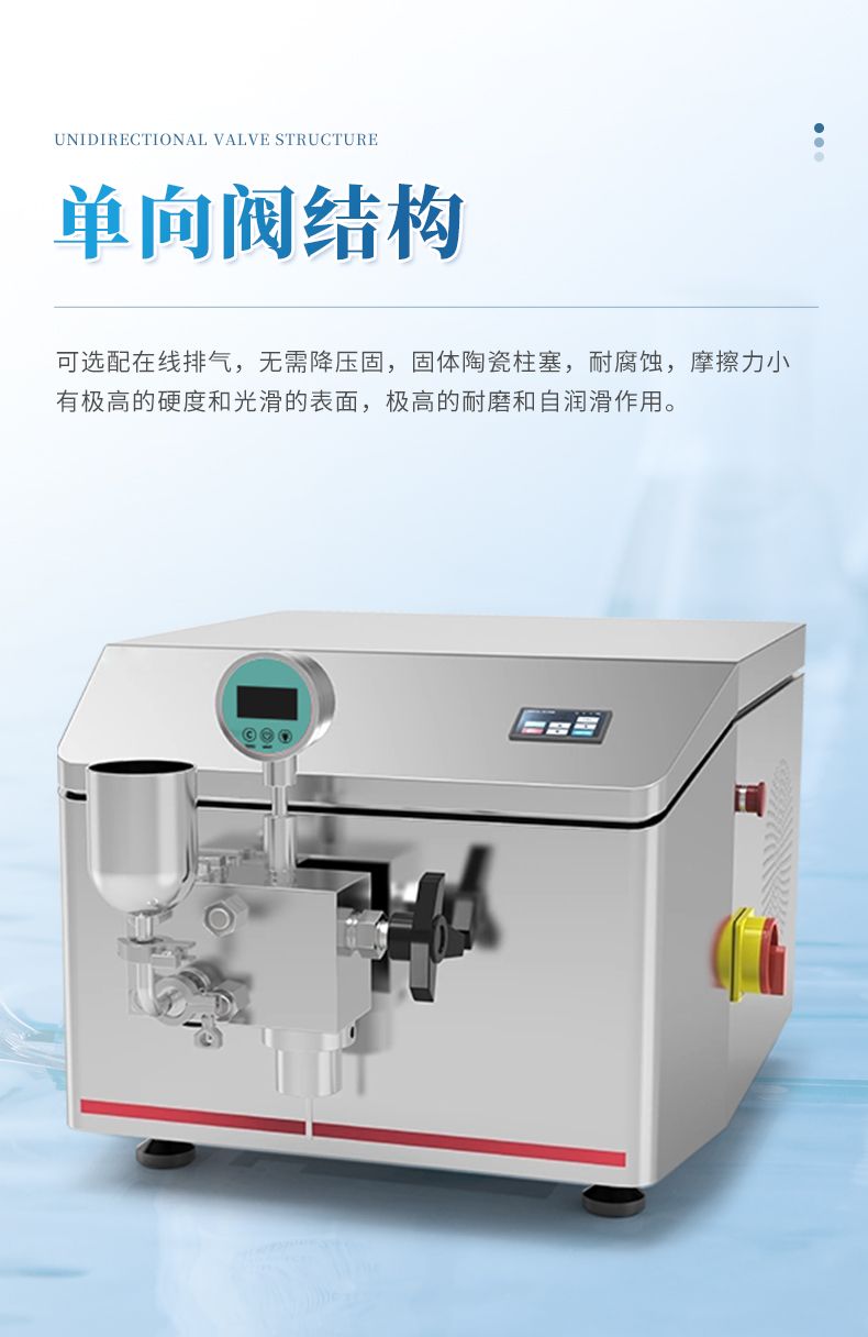 高壓均質機是以高壓往復泵為動力傳遞及物料輸送機構,將物料輸送至工作閥部分。物料在通過工作閥的過程中,在高壓下產生強烈的剪切、撞擊和空穴作用,從而使液態物質或以液體為載體的固體顆粒得到超微細化。