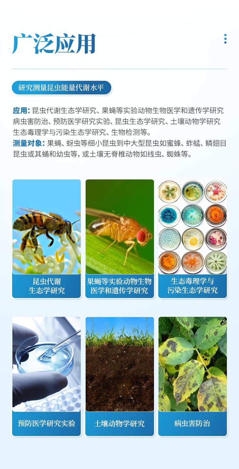 測量對象:果蠅、蚜蟲等細小昆蟲到中大型昆蟲如蜜蜂、蚱蜢、鱗翅目昆蟲或其蛹和幼蟲等,或土壤無脊椎動物如線蟲、蜘蛛等。