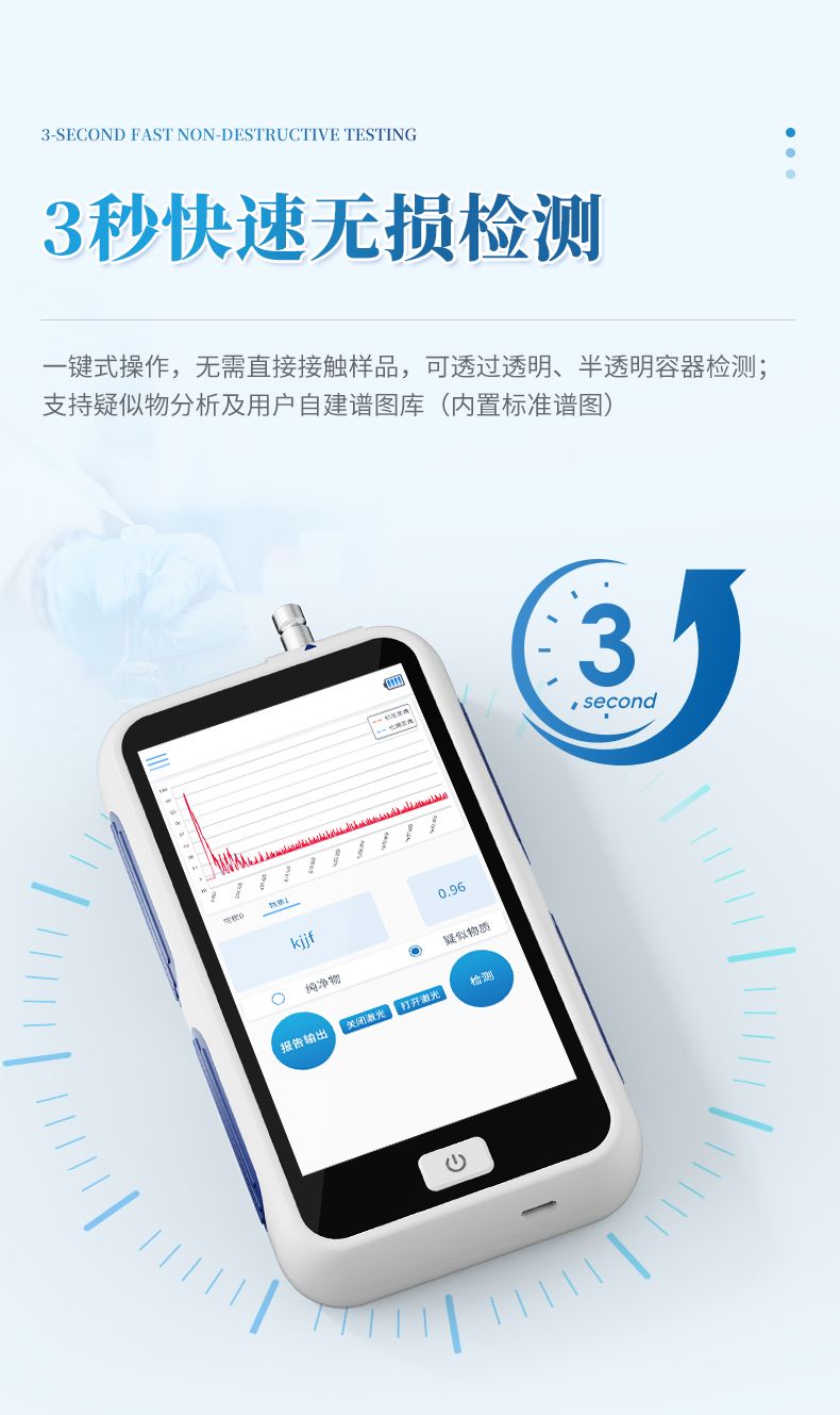 高效檢測:一鍵式操作,3秒內完成光譜采集(500ms積分時間),無需直接接觸樣品,可透過玻璃、塑封袋、飲料瓶等透明、半透明容器檢測;支持疑似物分析及用戶自建譜圖庫(內置標準譜圖);