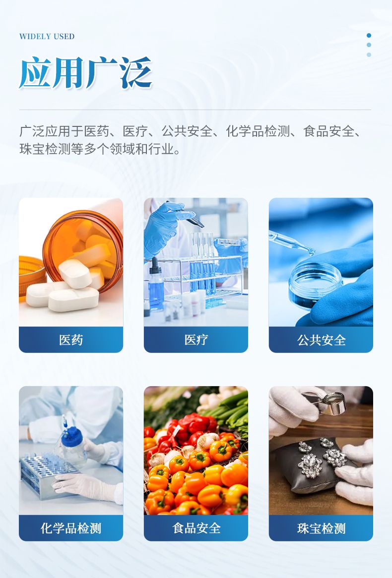 適用于現場快速檢測,廣泛應用于醫藥、公共安全、化學品檢測、食品安全、珠寶檢測及工業材料分析等多重領域和行業。