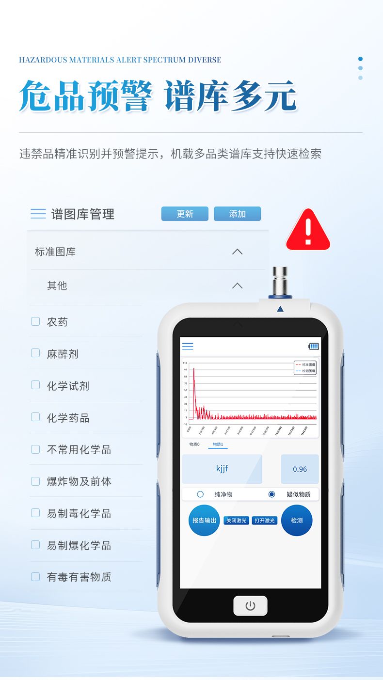 機載譜庫:靈活的機載譜庫包含化學藥品、爆炸物及前體、易制毒化學品、易制爆化學品、有毒有害物質、麻醉劑、化學試劑,農藥和不常用化學品。