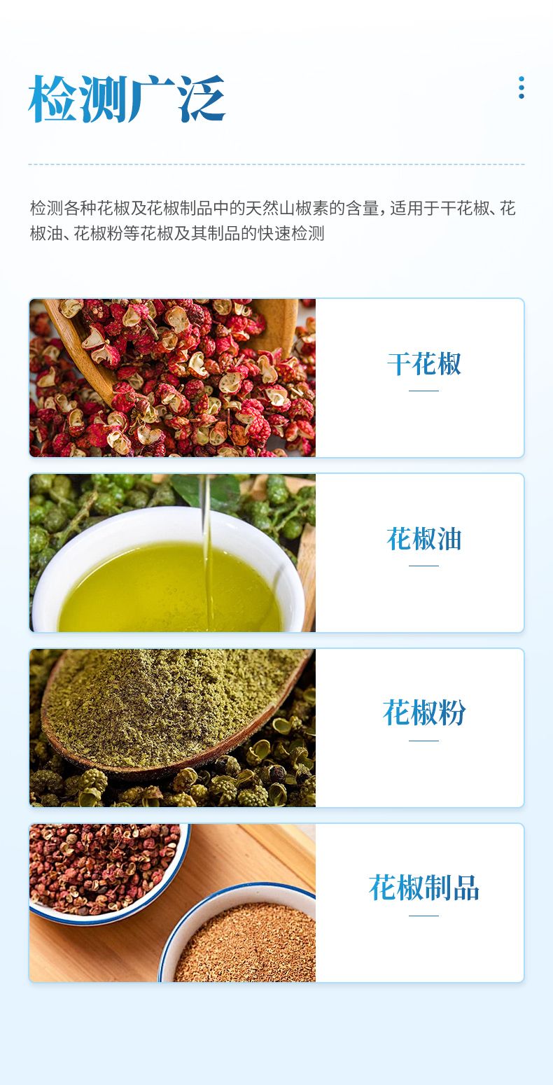 【產品簡介】樣品檢測范圍:花椒5-30mg/g 花椒油 0.6-3mg/g