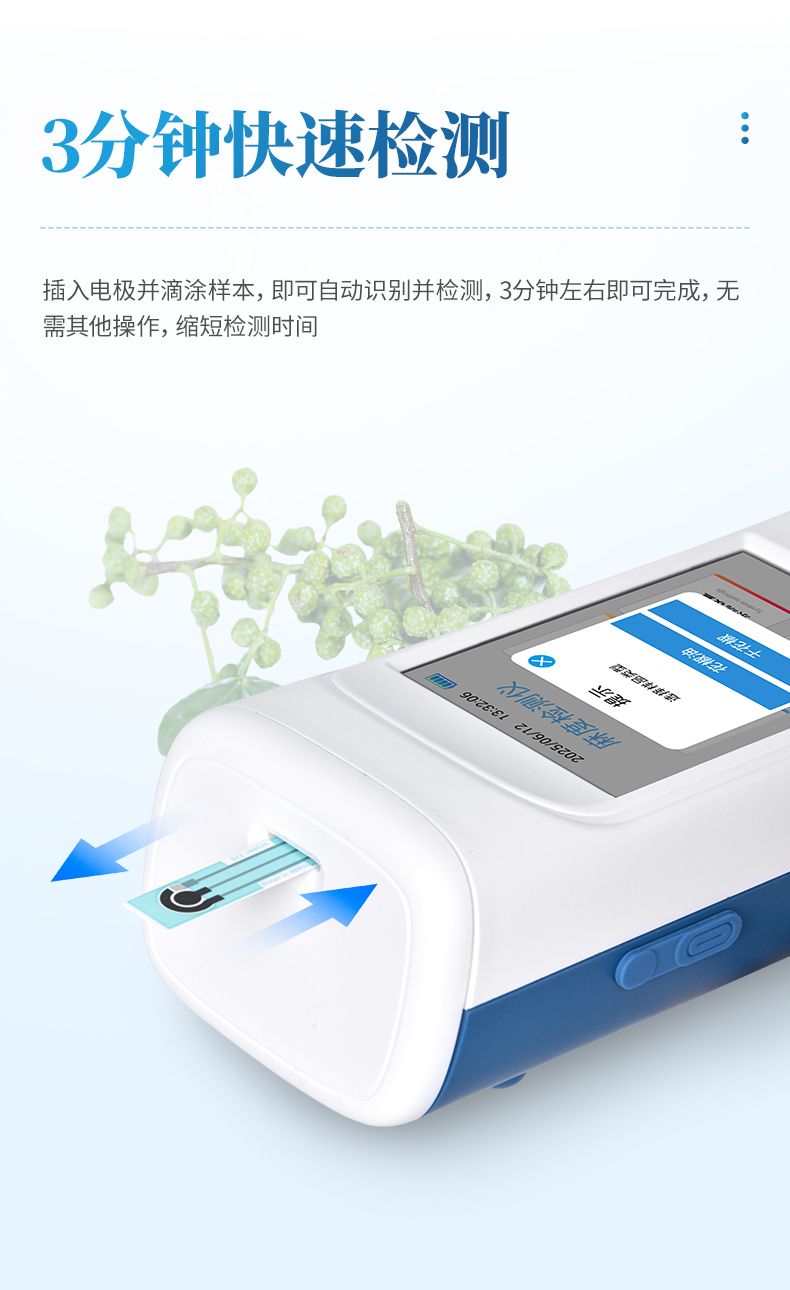 麻度檢測儀采用一次性三電極片在電位作用下,椒素在工作電極表面富集,然后在工作電壓下得失電子,發生氧化還原反應,這時電流信號在顯示器上呈現相應的氧化還原峰,根據峰電流的大小對花椒酰胺的含量進行定量分析。