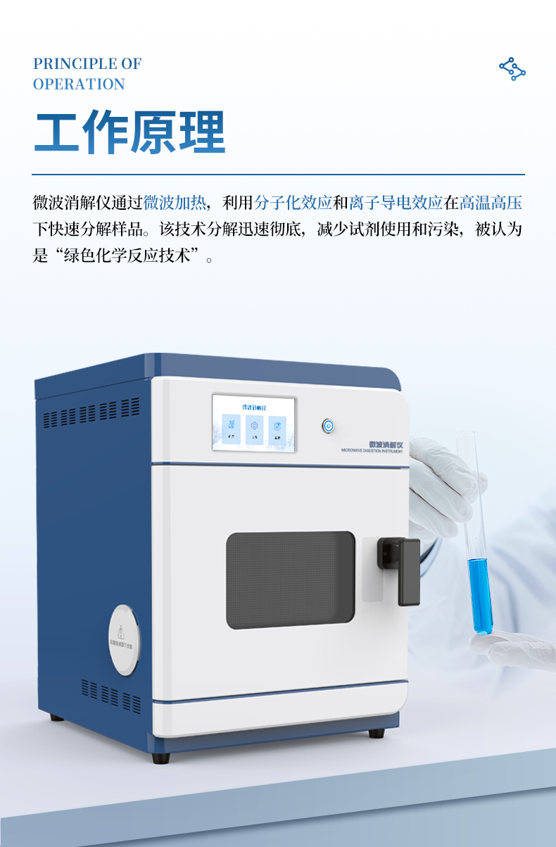 微波消解儀基于微波體加熱與高壓化學反應相結合的原理工作。核心磁控管發出的微波被消解罐內極性分子(如水、酸)吸收,引發分子高速振蕩摩擦,從樣品內部實現快速、均勻的加熱,大幅縮短前處理時間。