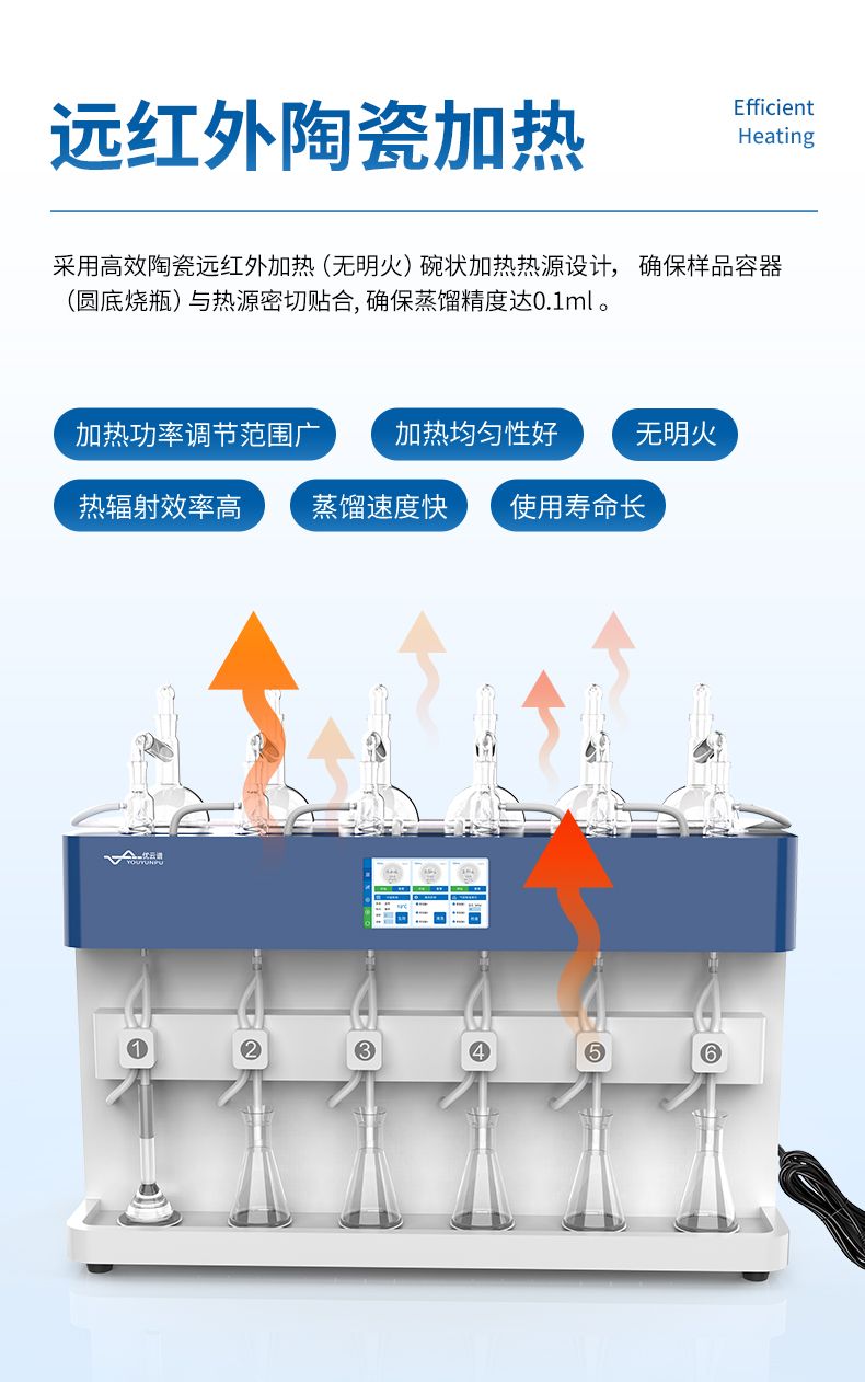 3、加熱模塊采用遠紅外陶瓷輻射加熱方式,碗狀加熱熱源設計,確保樣品容器(圓底燒瓶)與熱源密切貼合,加熱功率調節范圍廣、加熱均勻性好、熱輻射效率高,蒸餾速度快、使用壽命長。