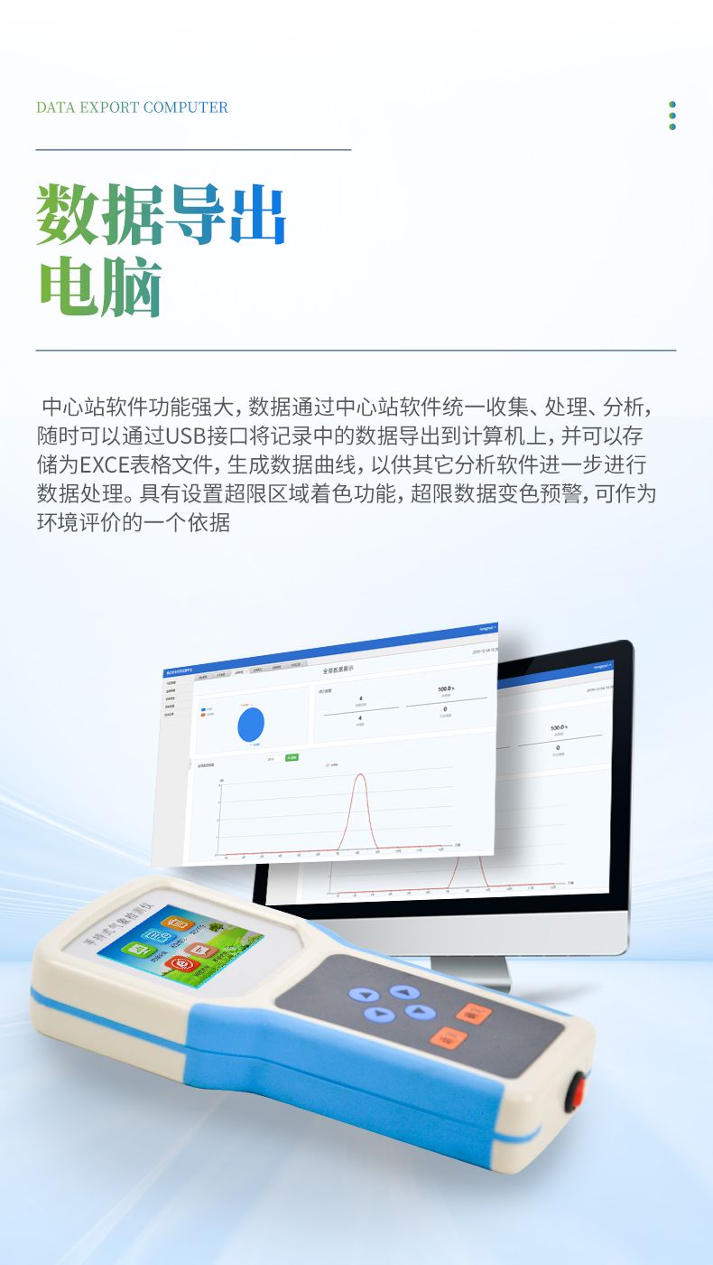 中心站軟件功能強(qiáng)大,數(shù)據(jù)通過中心站軟件統(tǒng)一收集、處理、分析,隨時(shí)可以通過USB接口將記錄中的數(shù)據(jù)導(dǎo)出到計(jì)算機(jī)上,并可以存儲(chǔ)為EXCE表格文件,生成數(shù)據(jù)曲線,以供其它分析軟件進(jìn)一步進(jìn)行數(shù)據(jù)處理。具有設(shè)置超限區(qū)域著色功能,超限數(shù)據(jù)變色預(yù)警,可作為環(huán)境評(píng)價(jià)的一個(gè)依據(jù)。