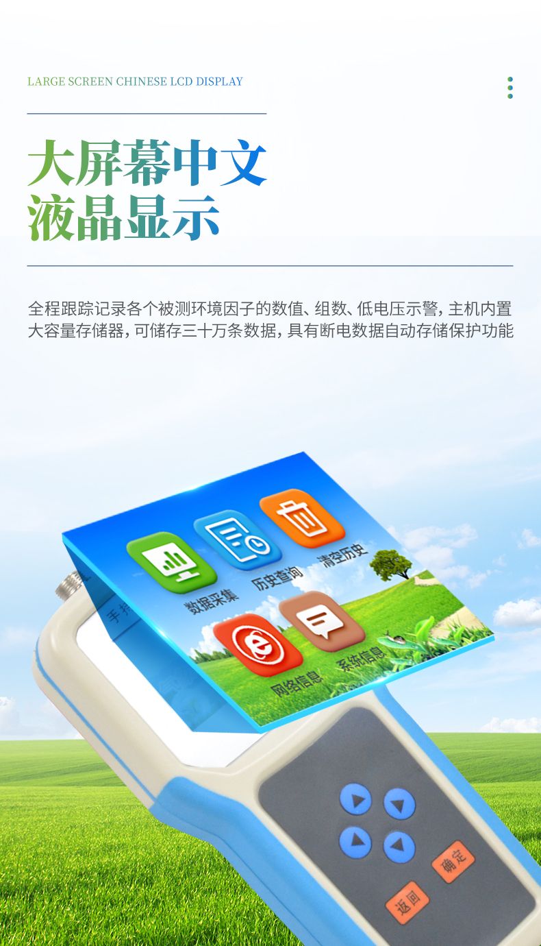 大屏幕中文液晶顯示,全程跟蹤記錄各個(gè)被測(cè)環(huán)境因子的數(shù)值、組數(shù)、低電壓示警,主機(jī)內(nèi)置大容量存儲(chǔ)器,可儲(chǔ)存三十萬條數(shù)據(jù),具有斷電數(shù)據(jù)自動(dòng)存儲(chǔ)保護(hù)功能。
