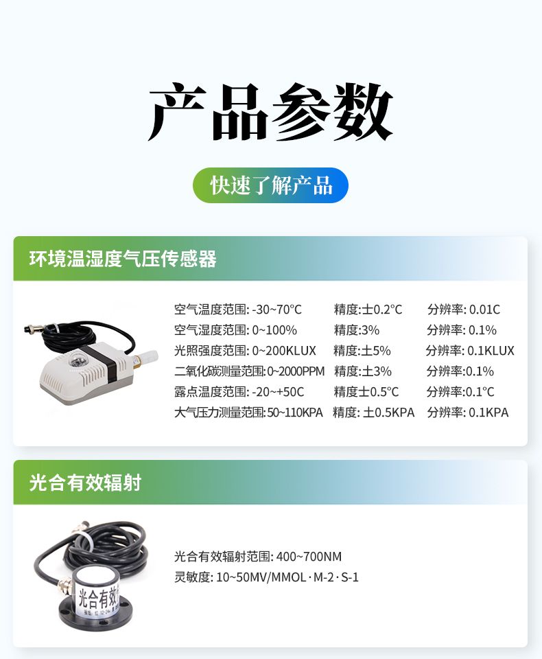 【產(chǎn)品簡介】觀測(cè)空氣溫度、空氣濕度、光照強(qiáng)度、二氧化碳濃度、露點(diǎn)溫度、光合有效輻射等6個(gè)環(huán)境參數(shù)氣象要素