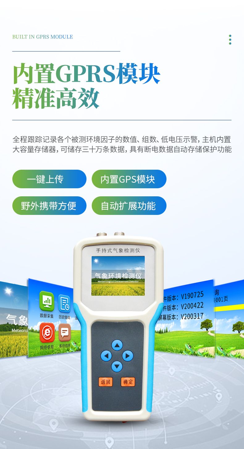 采用一體化結(jié)構(gòu)設(shè)計(jì),內(nèi)置GPS模塊,GPRS模塊,外置SD卡,能準(zhǔn)確的測(cè)量出被測(cè)地點(diǎn)的地理信息,界面除顯示所測(cè)環(huán)境參數(shù)、存儲(chǔ)數(shù)據(jù)外,還可顯示測(cè)點(diǎn)的經(jīng)緯度。通過內(nèi)置的GPRS一鍵上傳被測(cè)點(diǎn)的環(huán)境因子測(cè)量數(shù)據(jù)等。同時(shí)還可以通過外置SD卡直接把數(shù)據(jù)導(dǎo)出到電腦上。(可選)