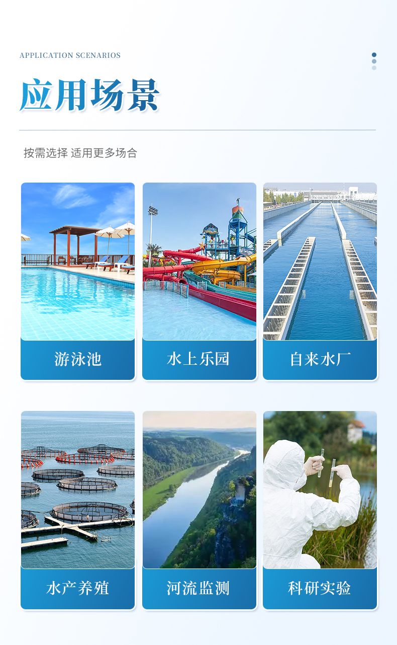 適用于游泳場館、戶內外游泳池、水上樂園、溫泉浴池、純凈水廠、自來水廠、生活污水處理廠、工業污水、水產養殖、河流監測、水源保護、生產監測、科研實驗等。
