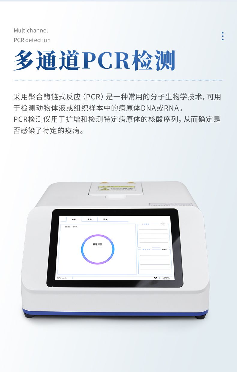 我公司開發的動物/寵物疫病檢測儀采用聚合酶鏈式反應(PCR)是一種常用的分子生物學技術,可用于檢測動物體液或組織樣本中的病原體DNA或RNA。PCR檢測儀用于擴增和檢測特定病原體的核酸序列,從而確定是否感染了特定的疫病。