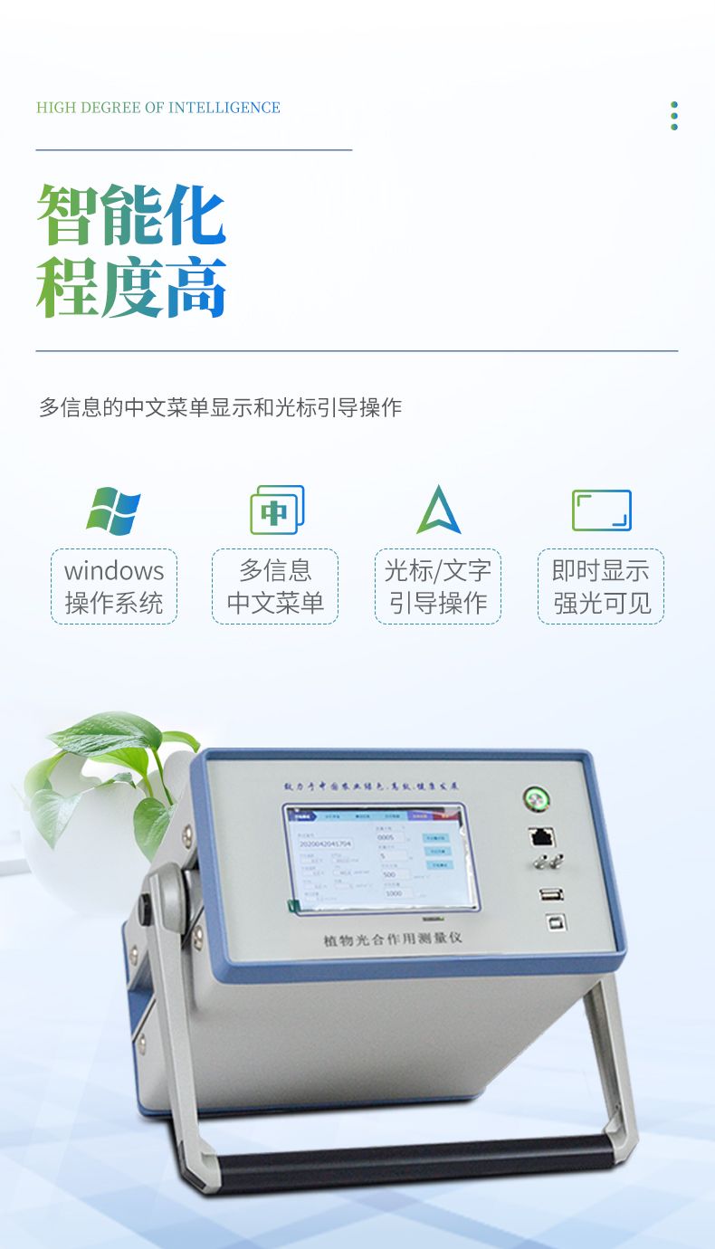 【產品簡介】同時測定光合速率、蒸騰速率、胞間二氧化碳濃度、氣孔導度和水分利用效率,以及二氧化碳濃度、相對濕度、光合有效輻射和空氣溫度、葉片溫度十項指標。