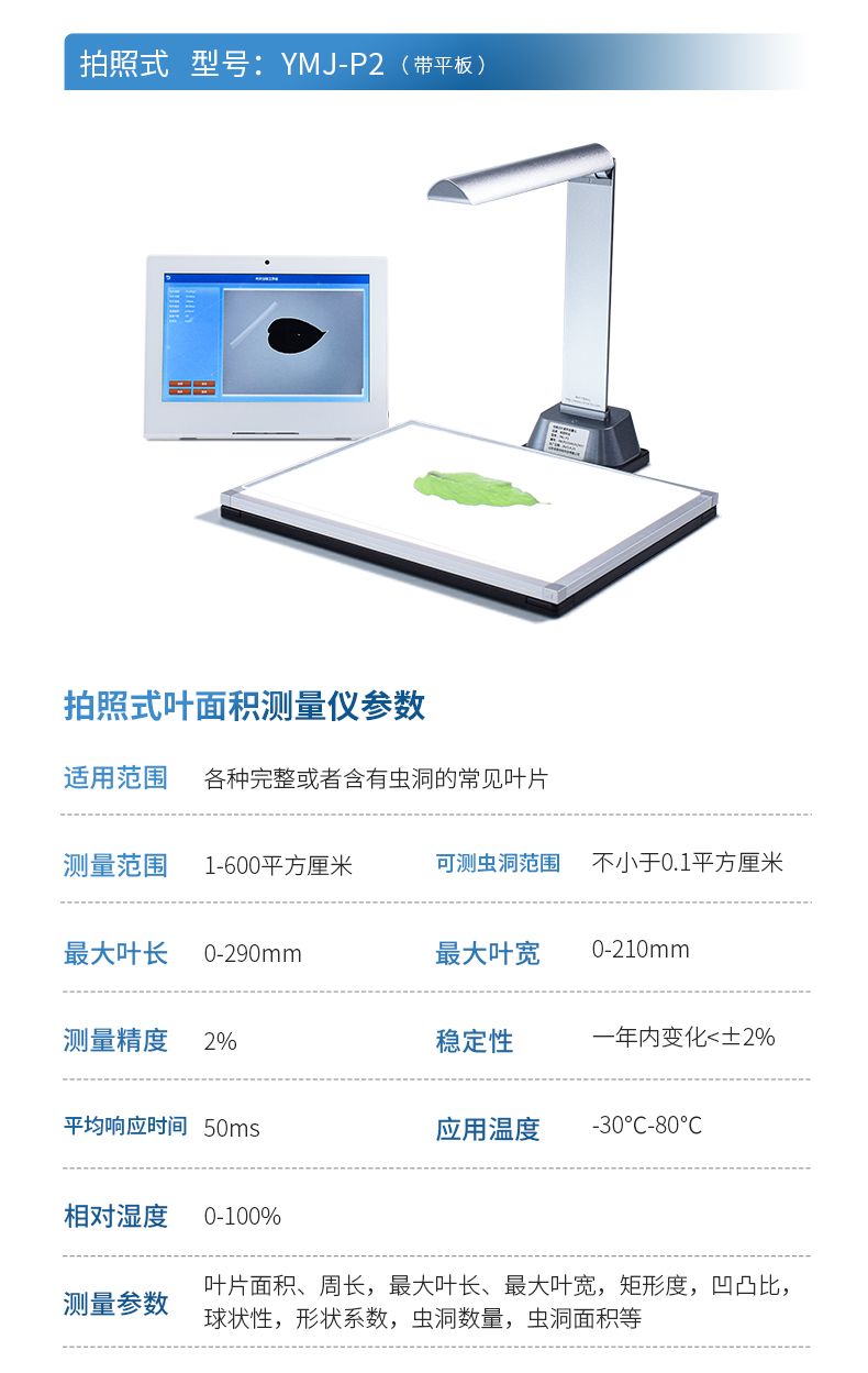 YMJ-P拍照式葉面積儀(電腦版)由圖像采集設備和圖像處理軟件組成,采用本公司新開發(fā)的圖像識別軟件,根據葉片輪廓特征提取、圖形實物轉換、邊緣檢測等技術,能夠形象并快速得到所測葉片面積、周長、蟲洞數量等參數。相比傳統(tǒng)的葉面積,具有測量更快速簡便、結果更形象客觀、數據多樣并大大減少了人為操作帶來的誤差。