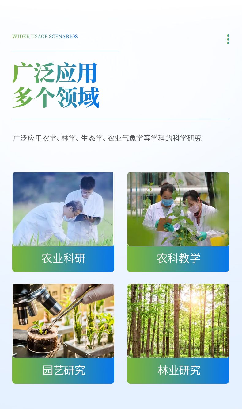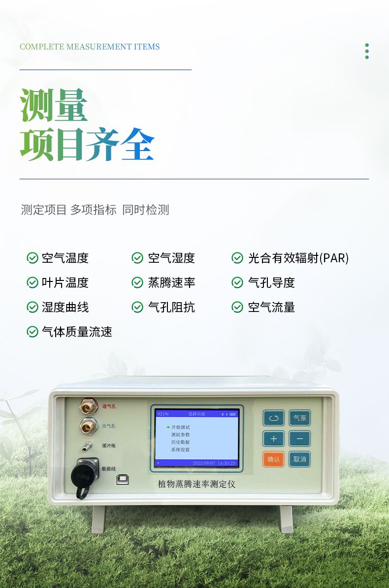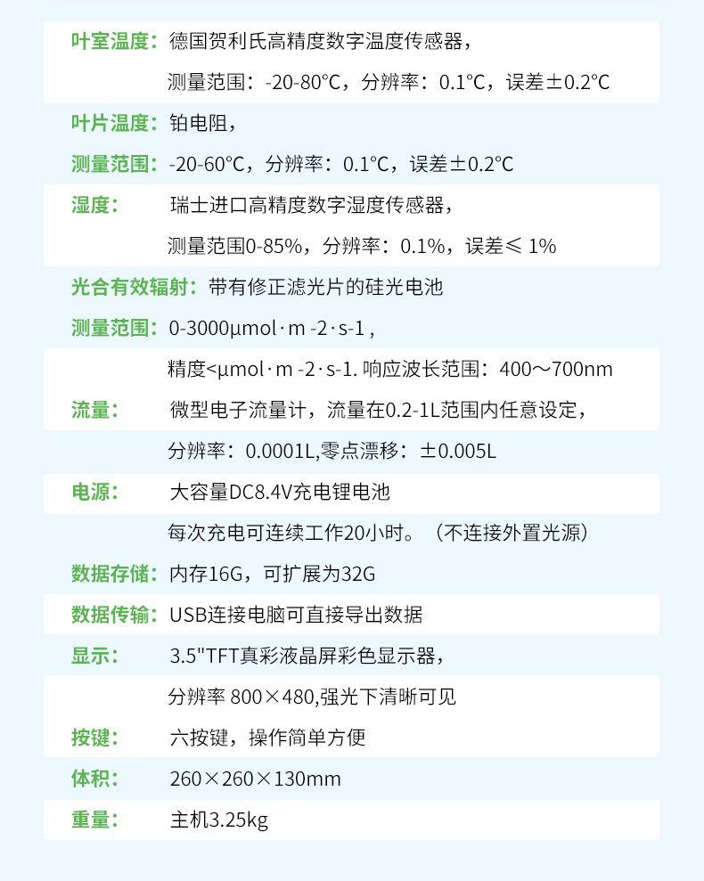 【產品簡介】蒸騰速率、氣孔導度、氣孔阻抗、葉片溫度、葉室溫度、葉室濕度、進氣濕度、出氣濕度、氣體流量、光合有效輻射、大氣壓力