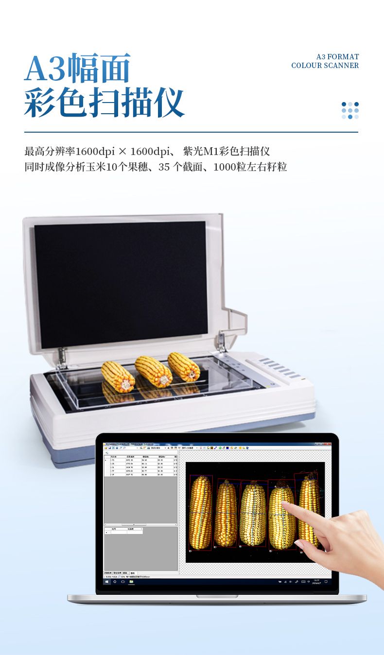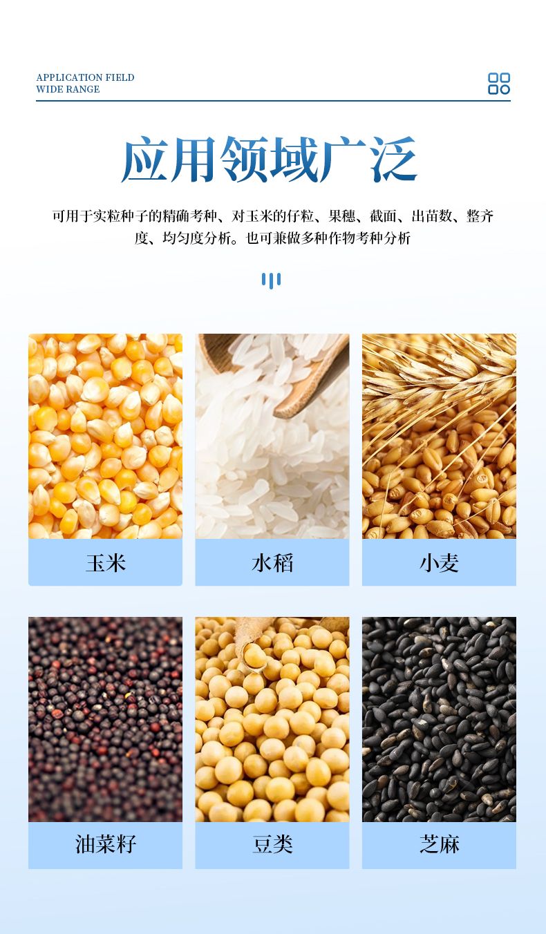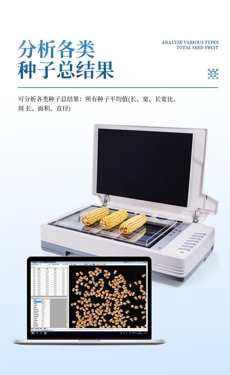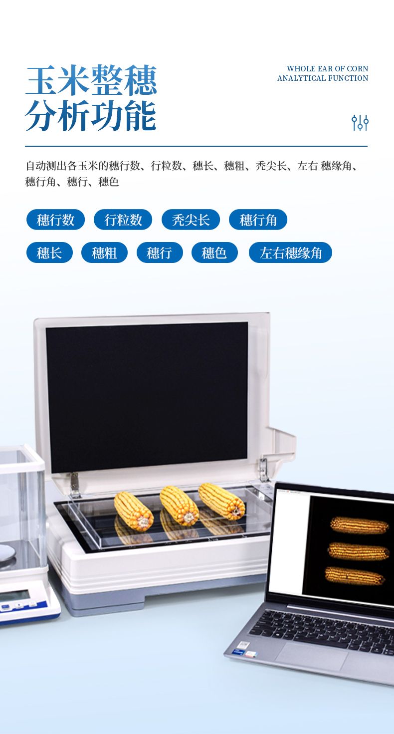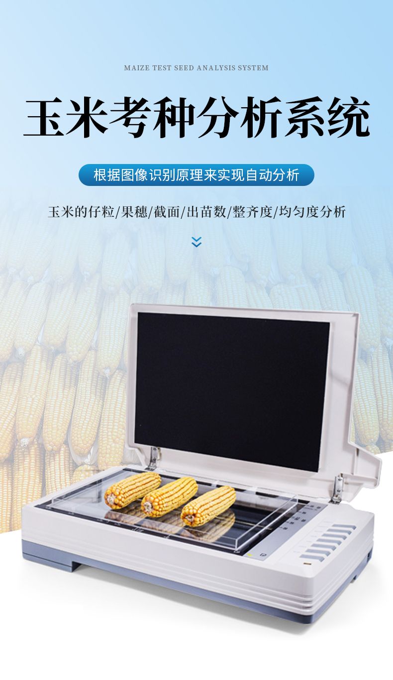 自動玉米考種分析及千粒重系統是根據圖像識別原理來實現自動分析的。可用于玉米實粒種子的精確考種、對玉米的籽粒、果穗、截面、出苗數、整齊度、均勻度分析。同時可兼做水稻、小麥、油菜、豆類、花生、芝麻等作物考種分析。