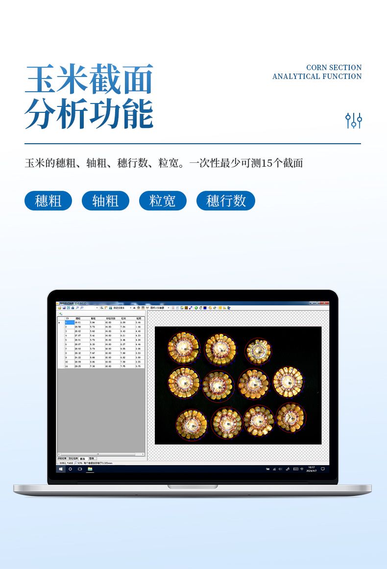 3、玉米截面分析功能:玉米的穗粗、穗直徑、軸粗、軸直徑、穗粒數、粒長、粒寬、粒周長、粒面積,一次性最少可測35個截面。