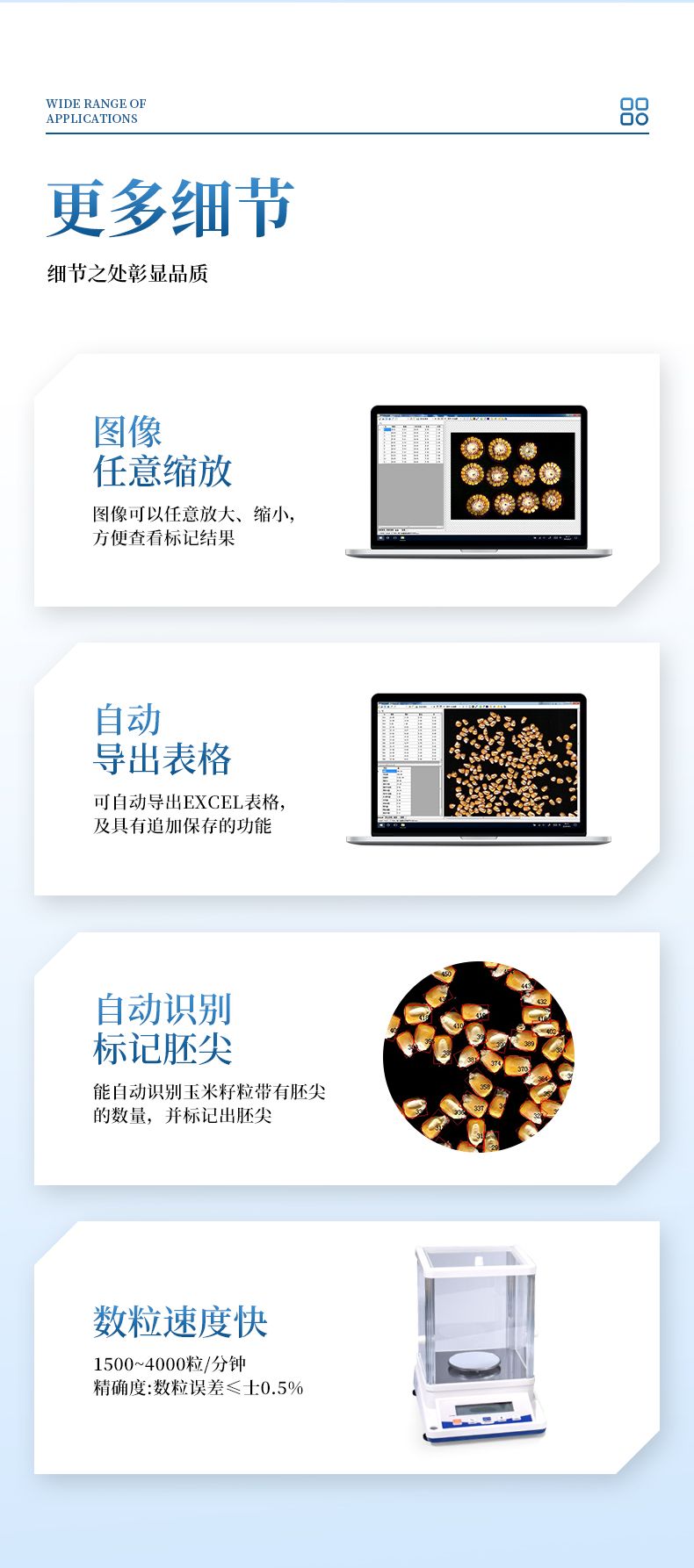 7、分析速度:可同時成像分析10個玉米果穗、35 個玉米截面、1000粒左右玉米籽粒。