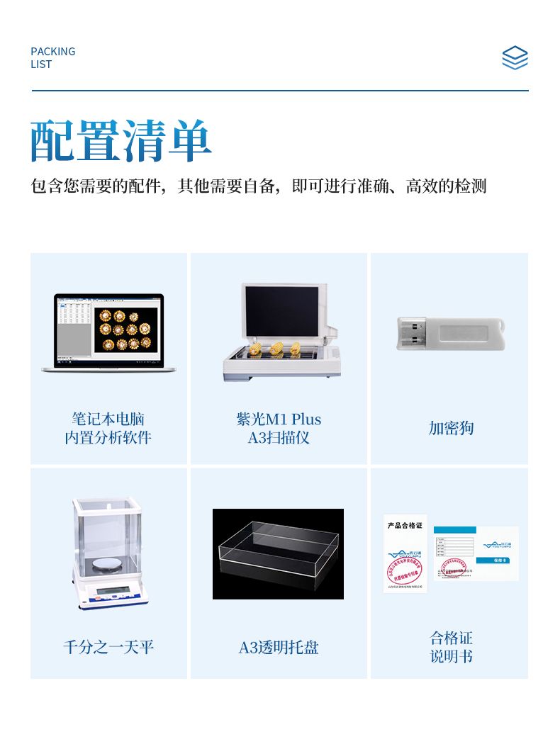 配置清單:筆記本電腦(內置分析軟件)、紫光M1 Plus掃描儀(A3)、加密狗、千分之一天平、A3透明托盤、合格證、說明書