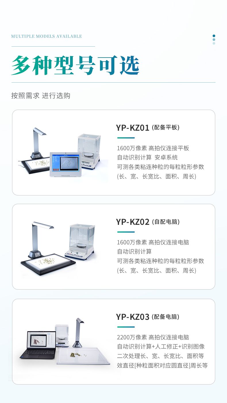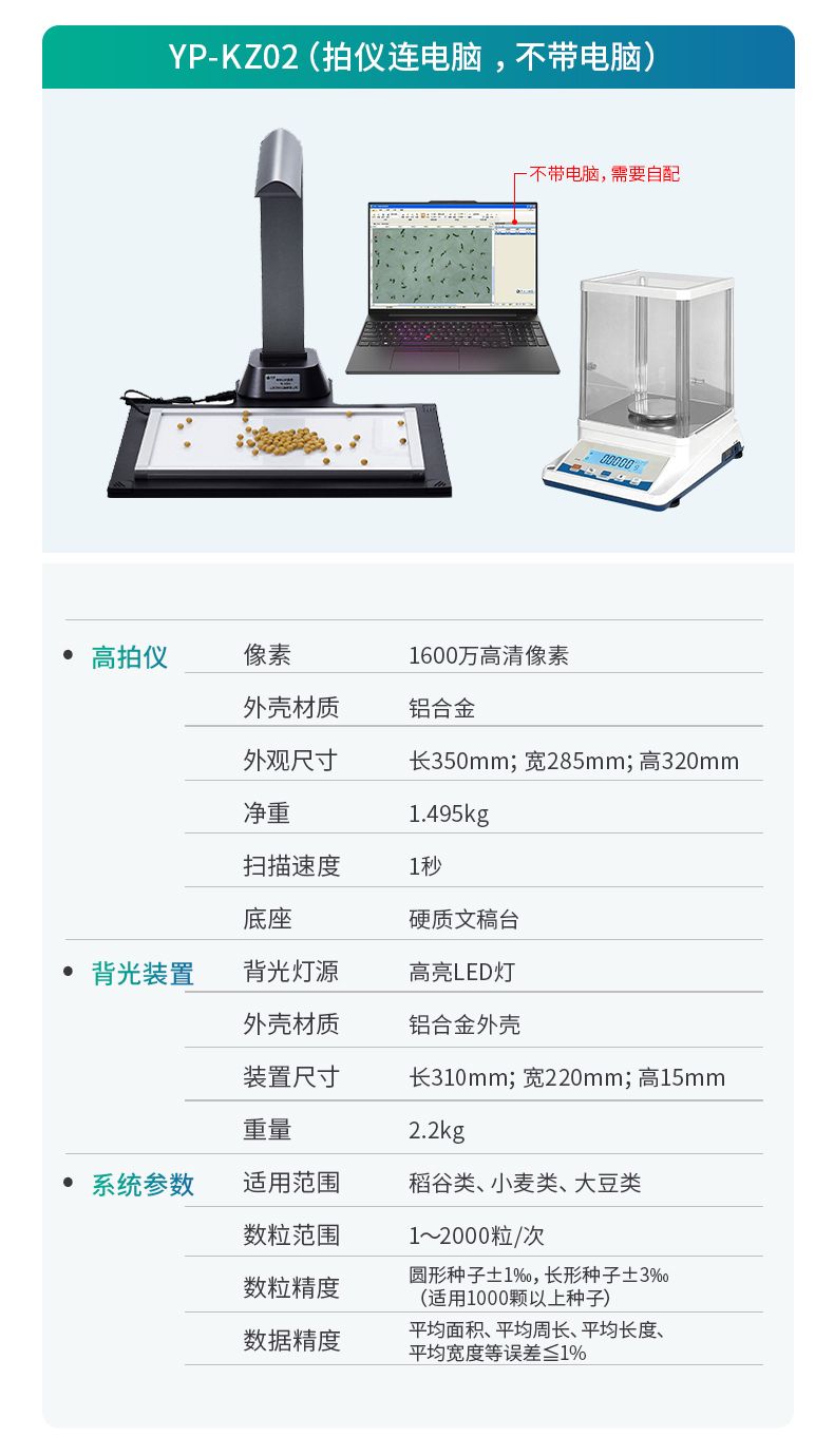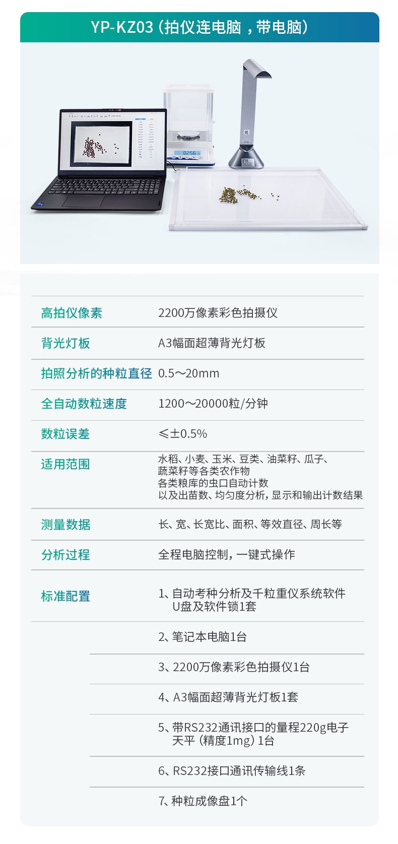 智能考種系統由三部分組成:1600萬高拍儀、背光裝置和裝有嵌入式軟件的平板。背光裝置采用的是高亮LED燈,外邊框使用鋁合金材質制成。軟件采用先進的圖像處理技術,根據距離變換原理、形態學、凸包檢測等技術綜合設計的一款嵌入式軟件。該設備主要應用在農業領域的田間作物測產及考種等方面,通過高拍儀拍攝的照片,軟件自動計算種子數量,種子的面積、周長、長度、寬度、長寬比等數據,根據天平所得的重量與種子的數量自動計算出千粒重;以列表和圖形的方式輸出結果,便于用戶查看與分析研究。本產品也可以手動對作物種子數量修正以確保計數精度、對數據進行保存,并且可以查看數據報表,最后可以將數據以Excel格式導出,或者通過WiFi數據上傳到儀器云數據管理系統從而實現數據統計,分析智能化。