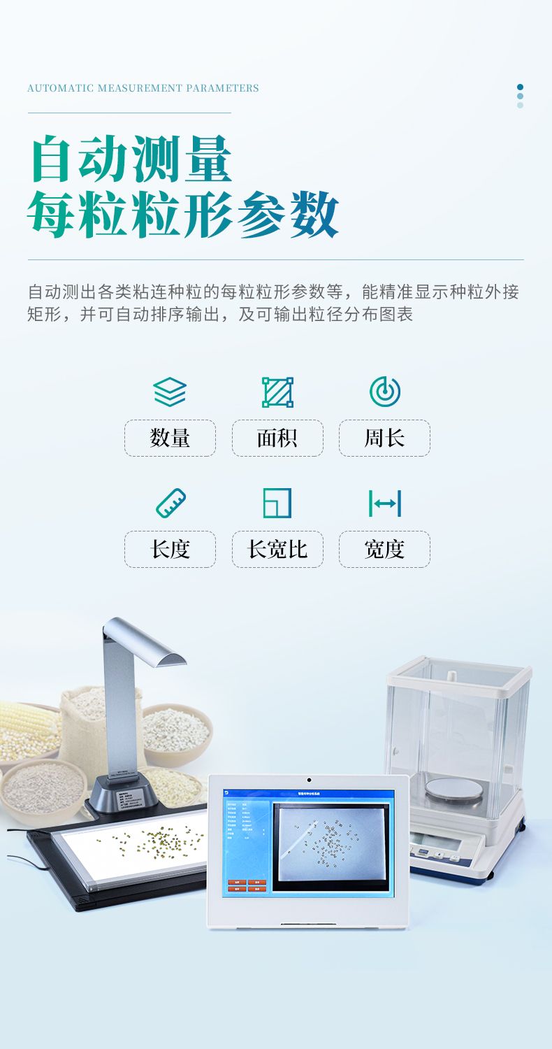 智能考種系統可以測量各種表面光滑的籽粒的數量、千/百粒重與平均粒型(包括長、寬、長寬比、周長、面積),利用圖像ORC 識別技術、圖像定位、空間轉換等技術實現快速識別種子數量及作物性狀指標。
