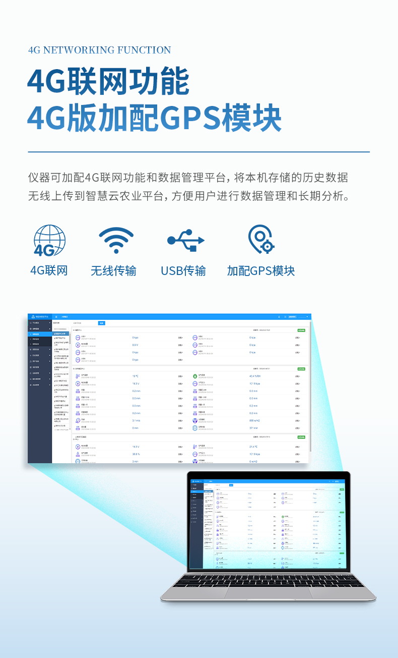 7、儀器配備4G聯(lián)網(wǎng)功能數(shù)據(jù)管理平臺(tái),將本機(jī)存儲(chǔ)的被測(cè)點(diǎn)環(huán)境因子測(cè)量歷史數(shù)據(jù)無(wú)線上傳到智慧云農(nóng)業(yè)平臺(tái),方便用戶進(jìn)行數(shù)據(jù)管理和長(zhǎng)期分析。