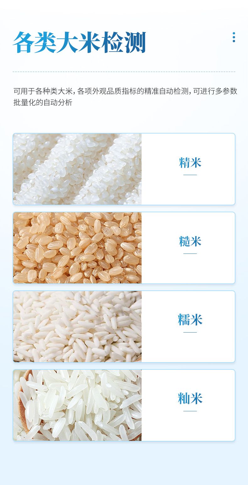 2、★可自動一次性測量分析30g以上大米樣品的:堊白度/率、碎米率及小碎米率、整精米數量、整精米率、可直接檢測大米透明度的國標等級、黃粒米、大米顏色黃度指數和大米白度測定、雜質量、異品種粒、不完善粒(未成熟粒),及糯米的陰米率、病斑或黃變率。還可自動分析大米的裂紋率,糙米胚芽率。