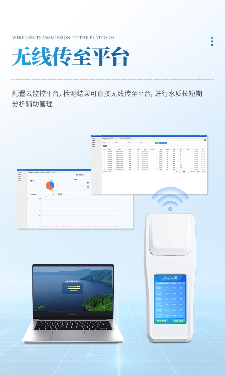 ②配置云監控平臺,檢測結果可直接無線傳至平臺,進行水質長短期分析,輔助管理。