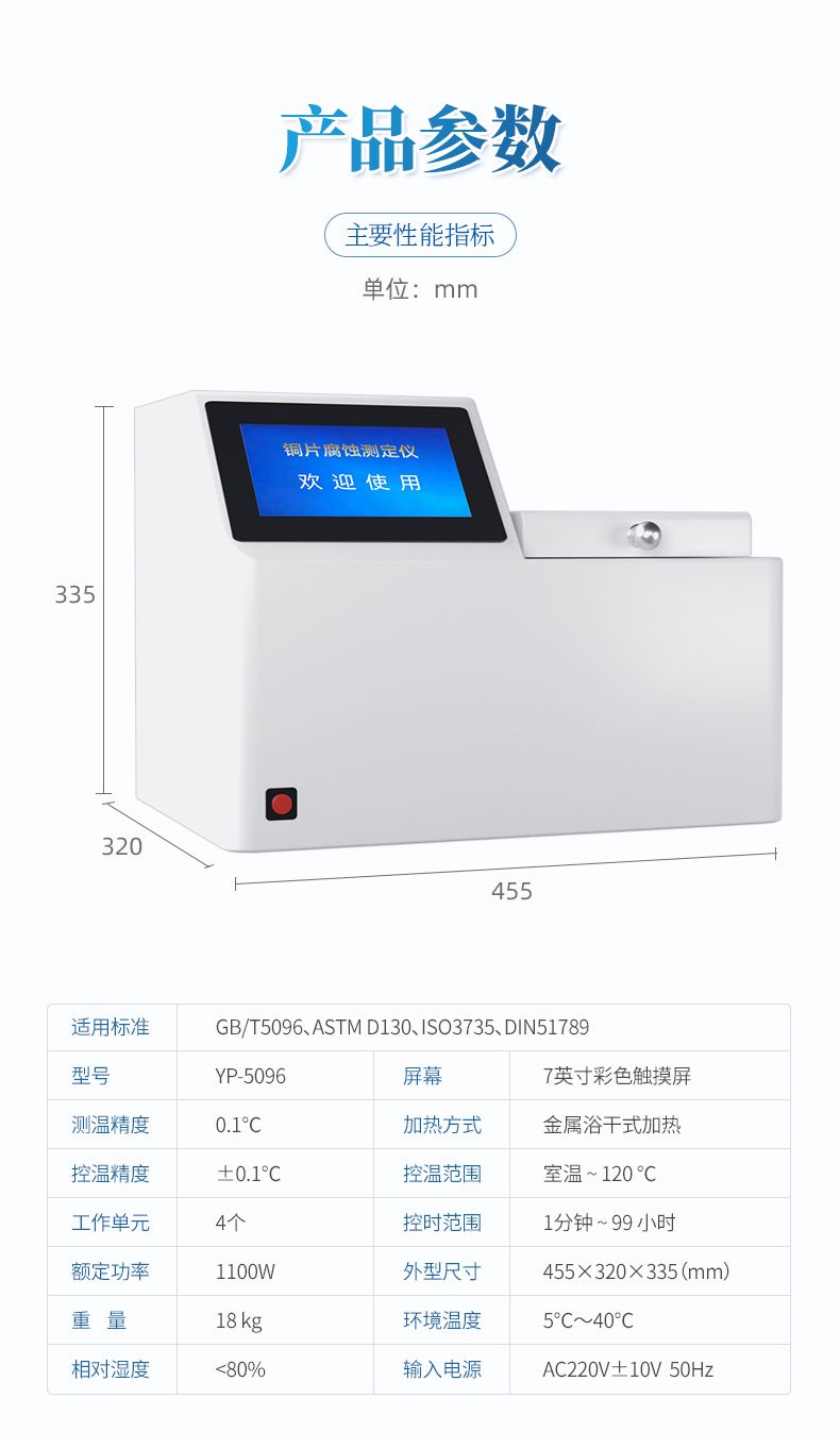 YP-5096石油產(chǎn)品銅片腐蝕試驗(yàn)器采用先進(jìn)的32位MCU,7英寸大屏幕液晶顯示,具有測(cè)溫精度高、升溫迅速、穩(wěn)定可靠、操作簡(jiǎn)便、易于維護(hù)的優(yōu)點(diǎn)。本機(jī)適用于變壓器廠、供電部門、煉油廠、鐵路、航運(yùn)、貯油站及商業(yè)部門對(duì)石油產(chǎn)品腐蝕性質(zhì)進(jìn)行監(jiān)測(cè)和控制,進(jìn)行快速分析的必要儀器。測(cè)量結(jié)果符合GB/T5096方法規(guī)范。