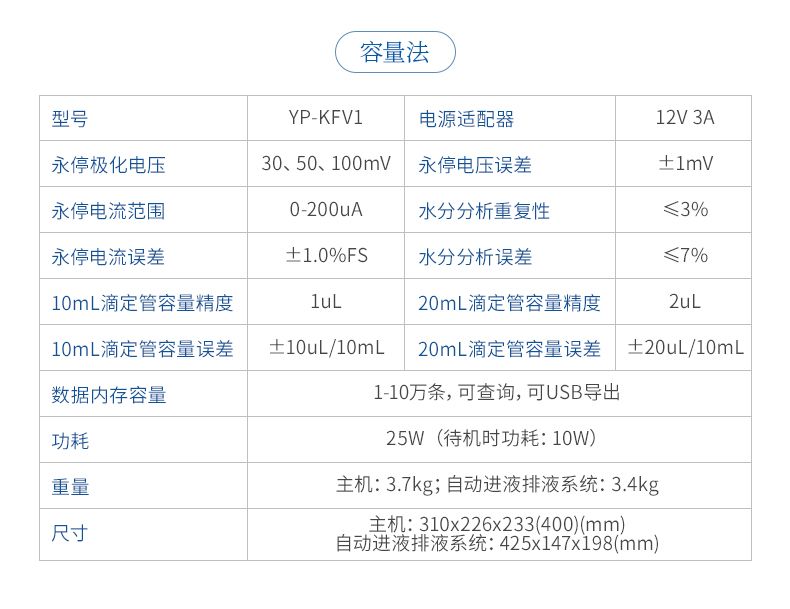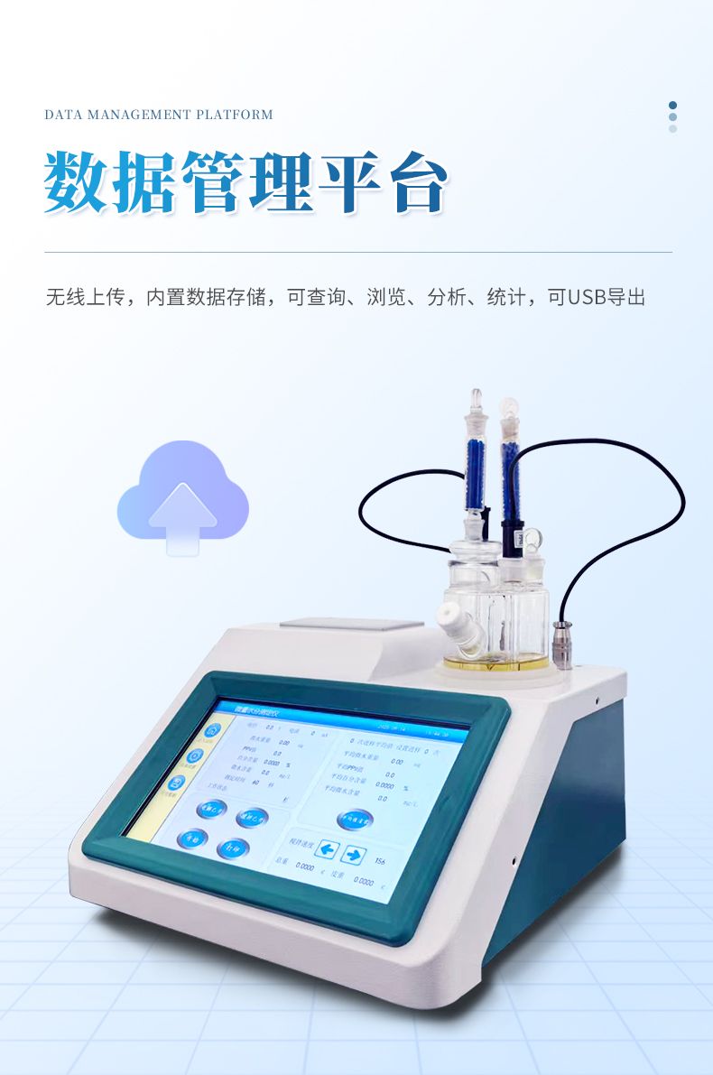 2.儀器具有試驗結(jié)果存儲、打印、計算功能;樣品測定過程由儀器自動控制,攪拌、測定60秒左右自動完成,直接顯示測定結(jié)果;全密封滴定池瓶,避免試劑與人接觸,也避免環(huán)境濕度的影響;并具有自動計算平均值和歷史記錄打印功能,能打印出百分含量、樣品編號、試驗員、實驗日期等內(nèi)容;儀器準(zhǔn)確度為:①水含量小于10微克水時,測量值誤差小于2ug水;②水含量在10微克-1000微克水時,測量誤差≤2ug水;③水含量在1000微克以上時,測量值誤差≤0.2%(不含進樣誤差);