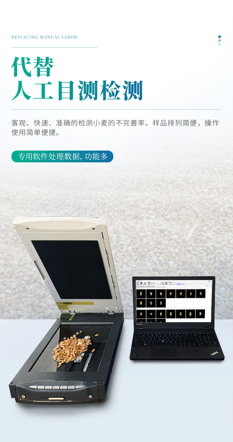 小麥不完善軟件連接專用掃描儀,掃描出小麥正反兩面的電子照片,通過軟件識別自動對檢測的小麥樣品進行計數(shù)分類計算。從而獲得整體小麥的分類品質(zhì)。