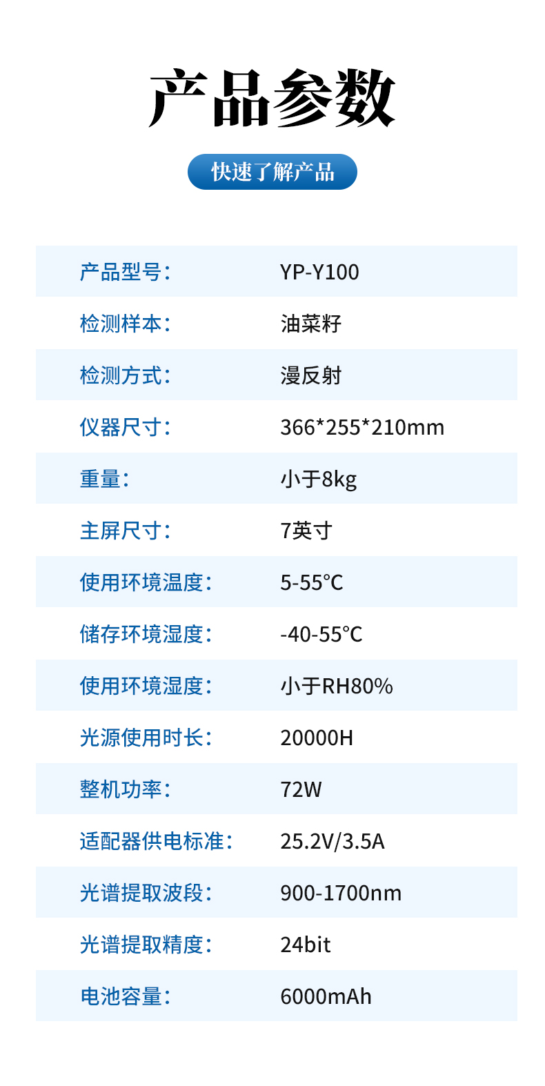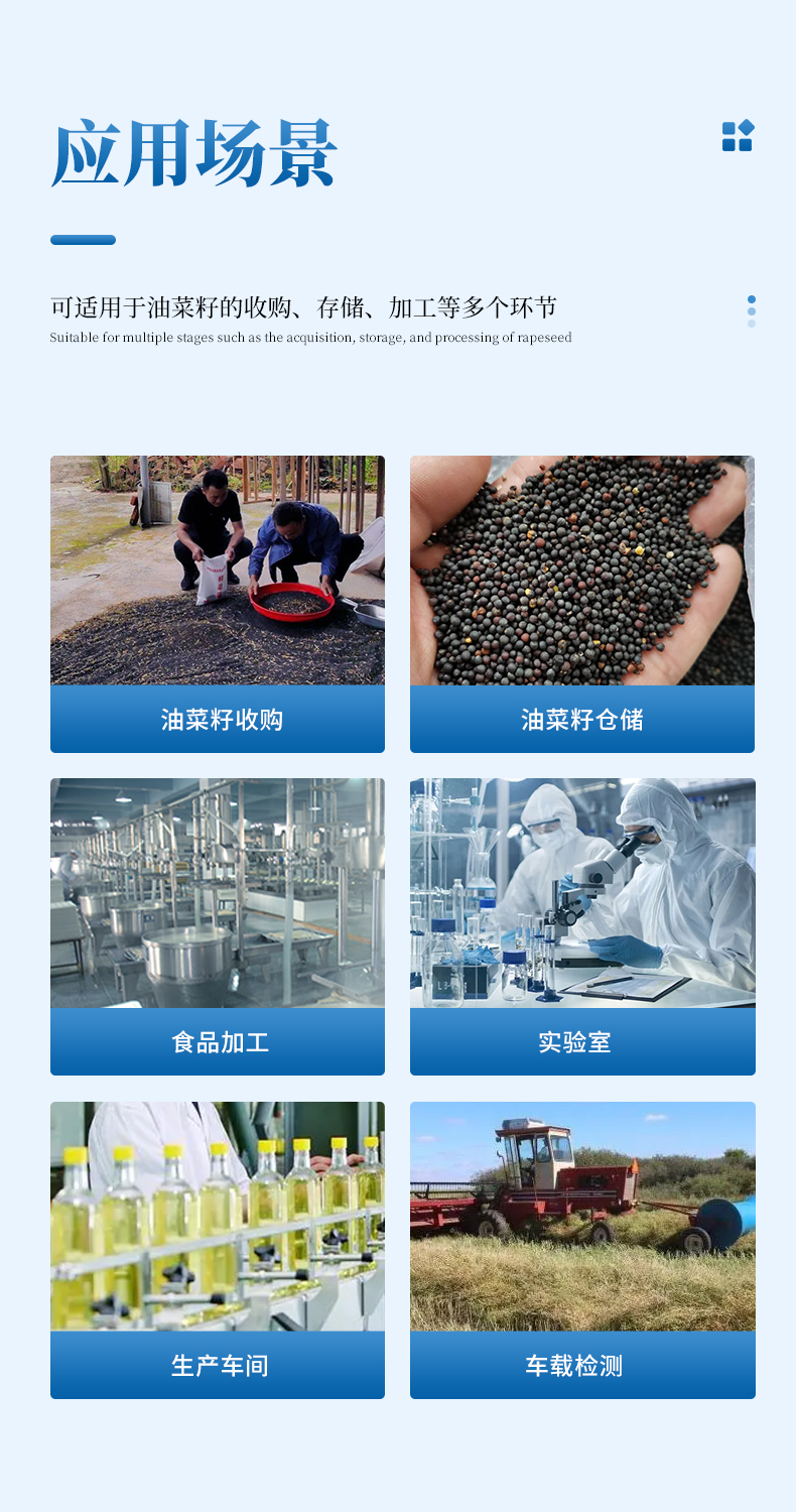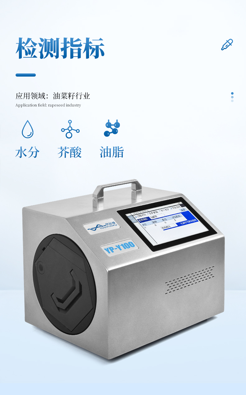 便攜式油菜籽分析儀可適用于油菜籽的收購、儲存、加工等多個環節的快速、無損、多指標定量檢測分析,為油菜籽品質鑒定提供快速檢測方法。儀器可應用于實驗室、車間、野外現場等不同場合。