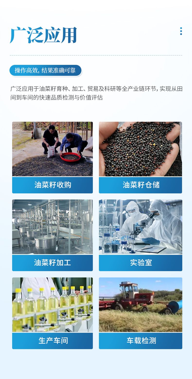 本儀器廣泛應用于油菜籽產業鏈的各個環節,為品質管控與價值評估提供高效解決方案。在育種端,可快速篩選優質種質資源;在加工端,服務于油脂、食品及飼料企業的原料驗收與生產過程控制環節;在貿易端,為現貨收購、期貨交割實現現場快速定價與品質鑒定。同時,是科研及檢測機構進行成分分析與科學研究的得力工具,全面覆蓋從田間到車間的精準檢測需求。