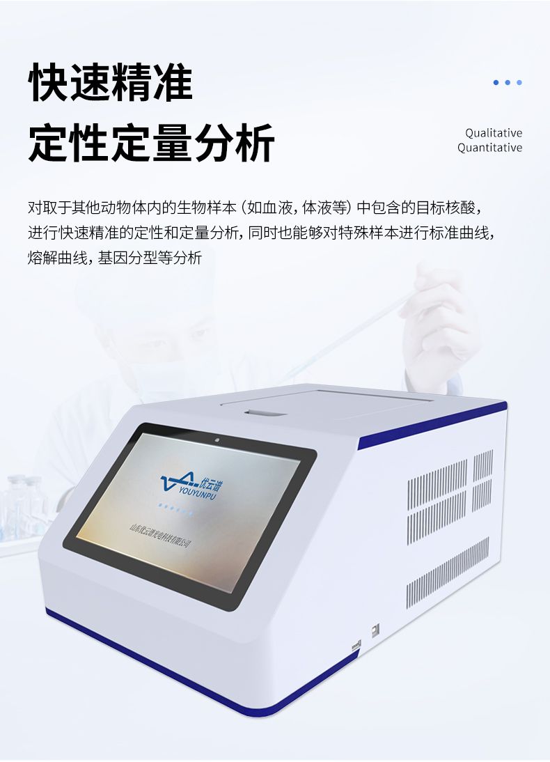 非洲豬瘟PCR檢測儀(實時熒光定量PCR儀支持變溫檢測)用于運行病毒檢測實驗,并對實驗數據進行分析;儀器既可在實驗室內操作,又可用于野外科學實驗,配合相應試劑,對取自待檢測樣本的分析物或其他分析物中的目標核酸進行快速、準確的定性檢測。