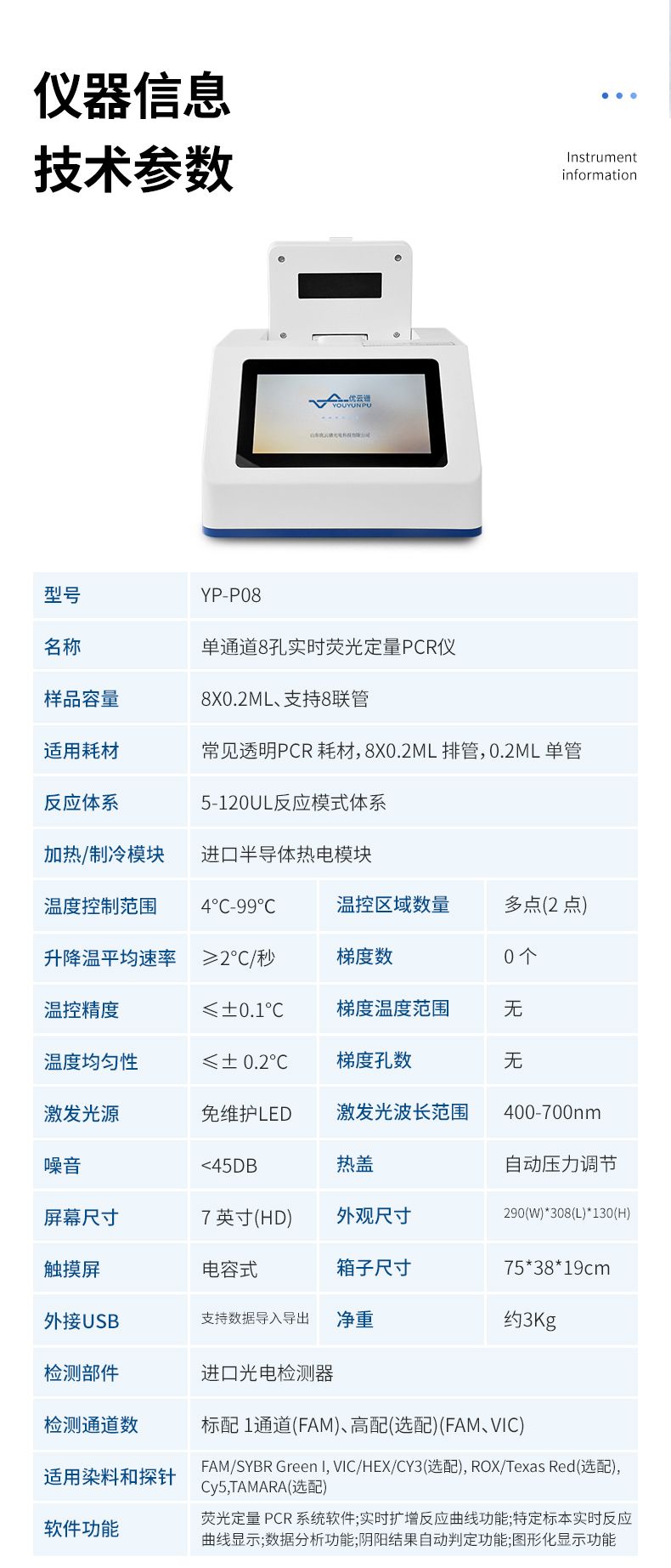 YP-P16型號 實時熒光定量PCR儀器的原理:聚合酶鏈式反應(polymerase chain reaction,PCR)是一種用于放大擴增特定的DNA片段的分子生物學技術,它可看作是生物體外的特殊DNA擴增,由高溫變性、低溫退火及適溫延伸等幾步反應組成一個溫度循環(huán)周期,使目的基因得以迅速擴增,具有特異性強、靈敏度高、操作簡便、省時等特點,是基因擴增技術的一次重大革新。PCR技術可將極微量的目標DNA特異地擴增上百萬倍,從而大大提高對DNA分子的分析和檢測能力。