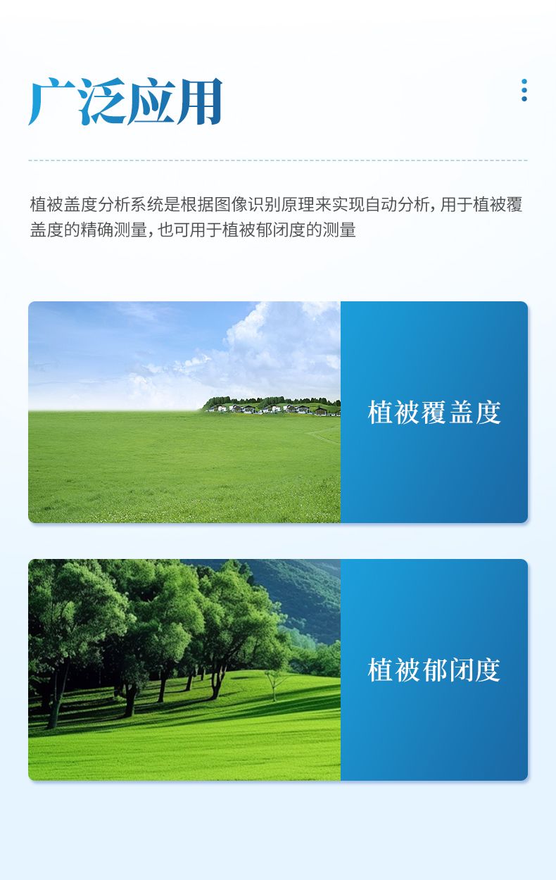 植被蓋度分析系統是根據圖像識別原理來實現自動分析,用于植被覆蓋度的精確測量,也可用于植被郁閉度的測量。