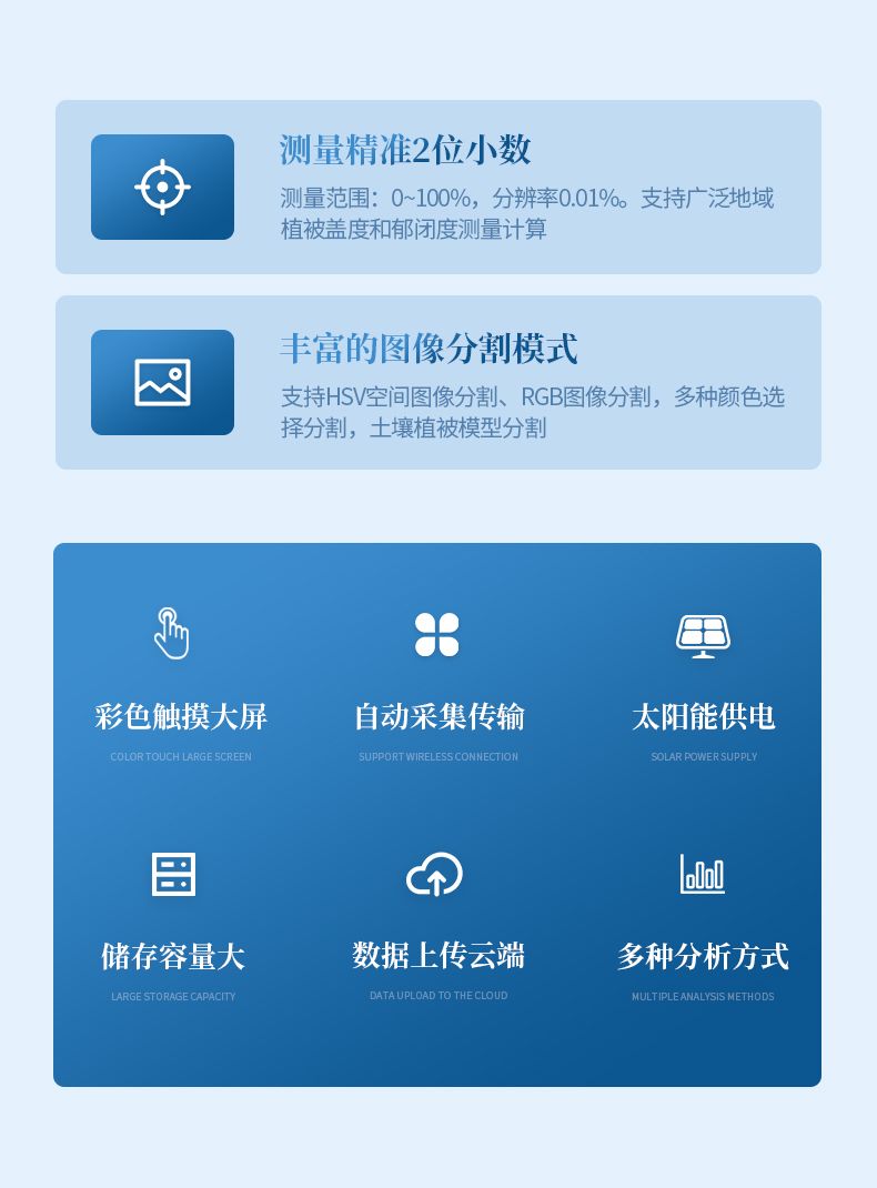 10. 多種分析方式,支持自動分析,手動RGB閾值分割分析、手動HSV閾值分割分析,圖片選色分析,植被土壤模型分析,測量準確度:≥90%。