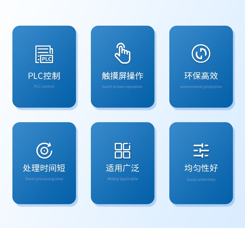 【效率高】:處理時間短,反應速率高,處理均勻性好;【節能、環保】:全程干燥的處理方式,不消耗水資源、無需添加化學藥劑、不產生污染。