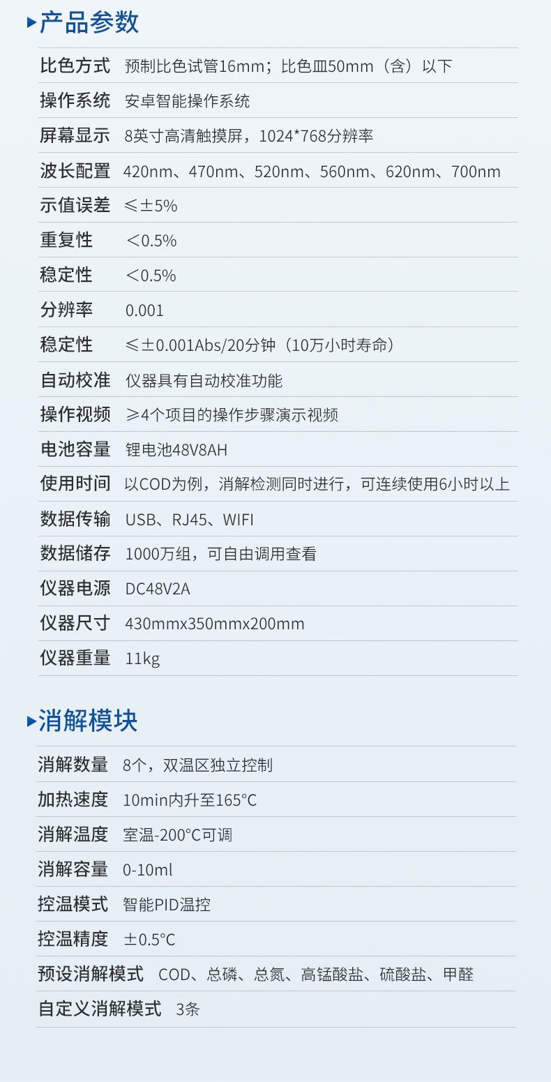 4、內(nèi)置雙溫區(qū)8孔消解儀,左右溫區(qū)獨立控制,可對COD總磷總氮等進行快速消解。