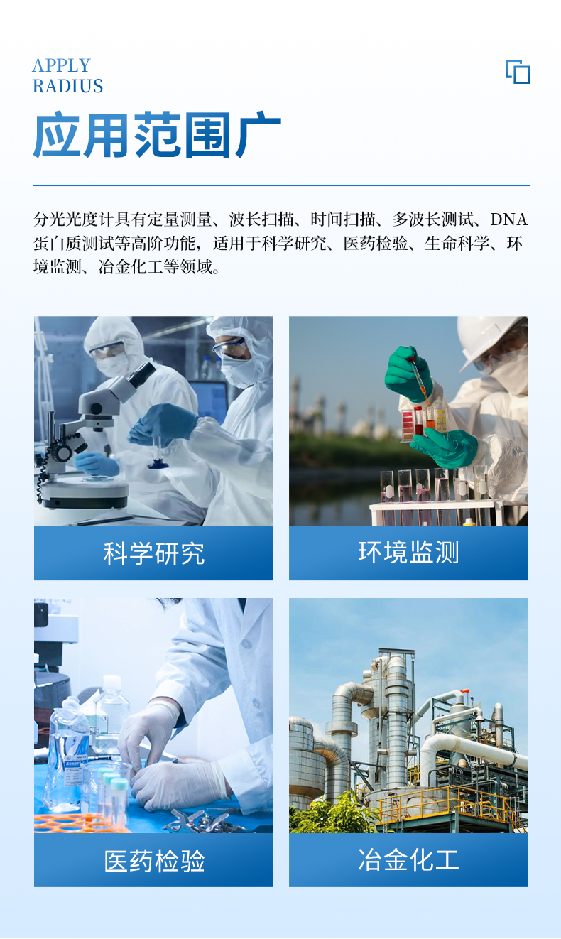 紫外可見分光光度計具有定量測量、波長掃描、時間掃描、多波長測試、DNA蛋白質測試等高階功能,具有高精度、高分辨率、低噪聲、低雜散光的特點,特別適用于科學研究、醫藥檢驗、生命科學、環境監測、冶金化工等領域。